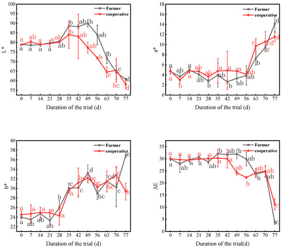 The color variation in the pulp of the pear is shown in Figure 5. The pulp of the Ruaner pear changed from light yellow to white during post-ripening and variable temperature frozen storage. The increase in L* value during mid-storage reflected carotenoid degradation and tissue dehydration, while the later decline indicated browning caused by enzymatic oxidation. The a* and b* values increased in the late stage, corresponding to the formation of brown pigments and Maillard-type reactions under repeated freeze–thaw cycles. The ΔE value remained stable initially but rose sharply after 49 d (cooperative) and 63 d (farmer), suggesting accelerated pigment oxidation and cell wall damage. These results demonstrate that freeze–thaw stress altered pigment composition and tissue integrity, leading to distinct color evolution between the two storage modes.