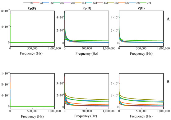 During post-ripening variable temperature frozen storage, the Cp, Rp, and Z values of farmers’ Ruaner pears decreased gradually with increasing detection frequency, as shown in Figure 6A. A similar trend was observed in cooperative-stored pears, as shown in Figure 6B, a trend consistent with previous dielectric studies on apples, kiwifruits, and pears. The parallel equivalent capacitance (Cp) reflects the macroscopic polarization capacity of tissues; its higher values at low frequencies are attributed to interfacial polarization at the cell membrane and the reorientation of polar molecules [33]. As frequency increases, dipole polarization lags behind the alternating field, leading to reduced energy storage and decreased Cp, consistent with findings in banana and citrus tissues under similar conditions [34].