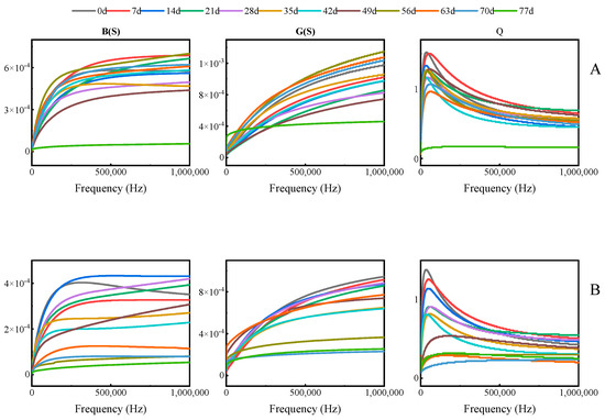 As ripening and freeze–thaw processes progressed, cooperatively stored pears exhibited pronounced declines in B, G, and Q values, suggesting increased electrolyte leakage, loss of membrane integrity, and higher energy dissipation due to microstructural damage. For instance, at 283,260 Hz, the B, G, and Q values decreased by 11.7-, 2.8-, and 2.4-fold at 77 d compared to 0 d, respectively. These findings align with those reported in frozen apples and citrus fruits, where repeated freeze–thaw cycles disrupted cell membranes and reduced dielectric polarization capacity. Overall, the dynamic changes in B, G, and Q values effectively reflect the progressive loss of cellular integrity and the accompanying physicochemical alterations in pear tissues during post-ripening and variable temperature frozen storage.