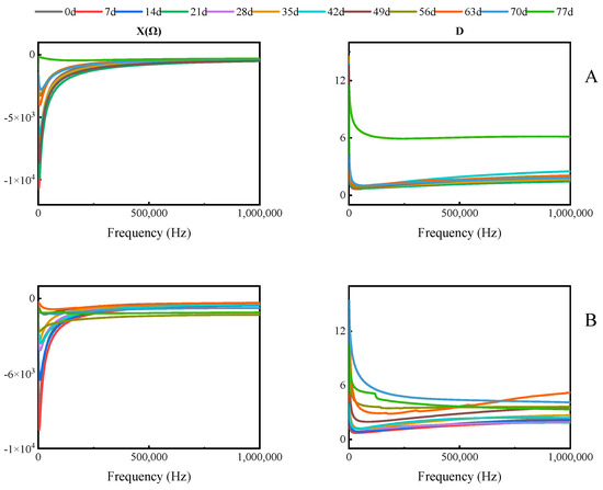 During the post-ripening variable temperature frozen period, the X and D values of farmer Ruaner pears exhibited a tendency to decrease and subsequently increase with increasing detection frequency, as shown in Figure 8A. The X and D values of cooperative Ruaner pears displayed a pattern of decreasing and subsequently increasing with the increase in detection frequency, as shown in Figure 8B. The impedance (X) serves as a significant attribute reflecting the conductivity of the dielectric itself. The dielectric loss coefficient (D) refers to the energy loss coefficient caused by the hysteresis effect of the dielectric conductivity and dielectric polarization under the action of the electric field.