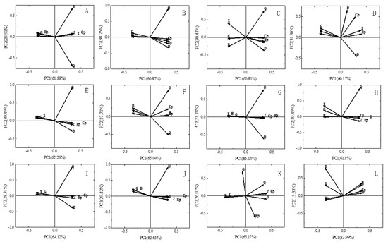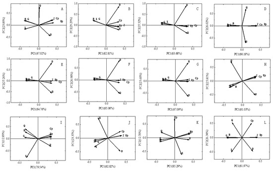 Principal component diagram of the Ruaner pear in cooperative, (A) 0 d; (B) 7 d; (C) 14 d; (D) 21 d; (E) 28 d; (F) 35 d; (G) 42 d; (H) 49 d; (I) 56 d; (J) 63 d; (K) 70 d; (L) 77 d.