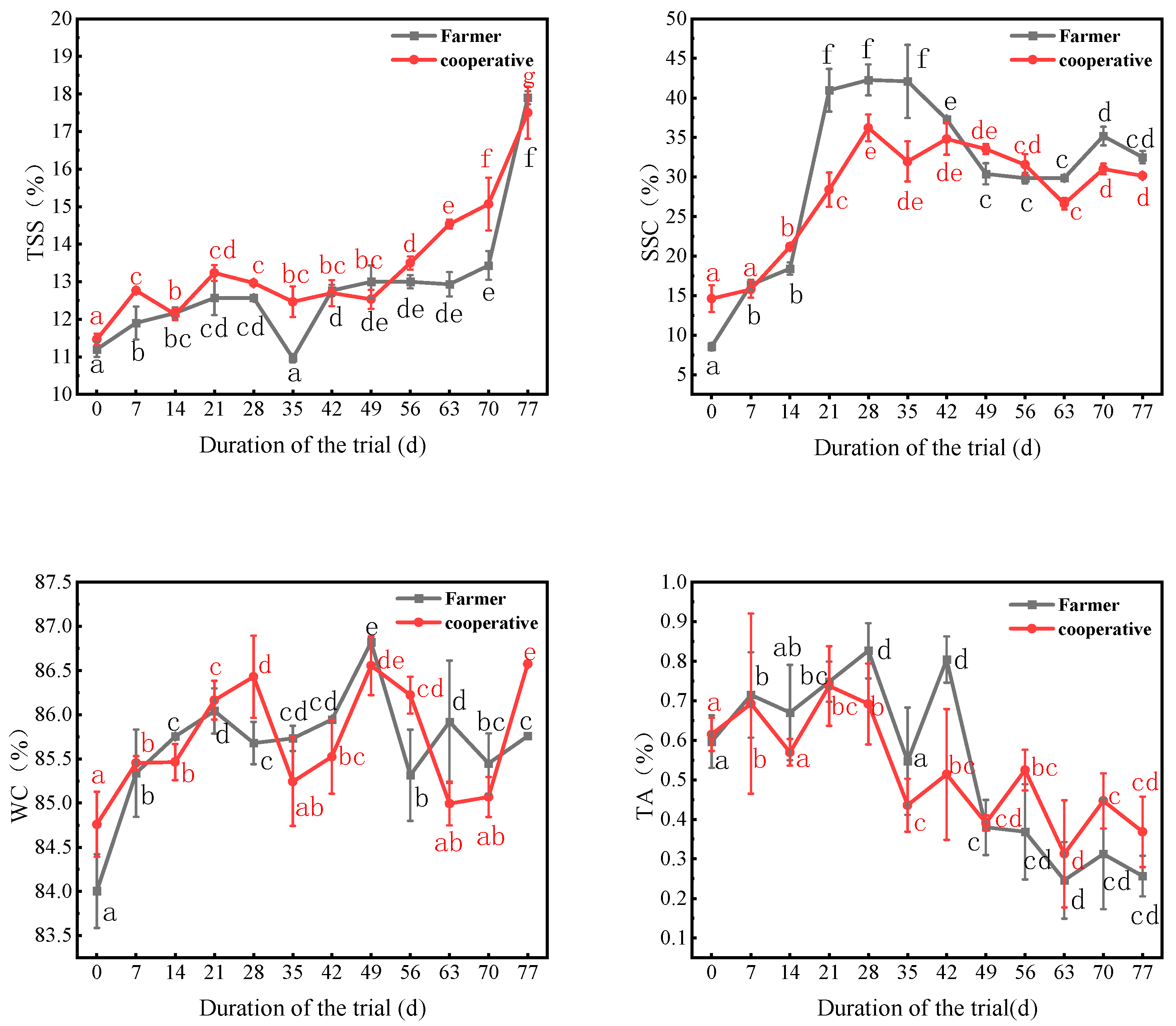 3.1. Changes in TSS, SSC, WC, TA, SCC, and TT During the Post-Ripening Variable-Temperature Frozen Period