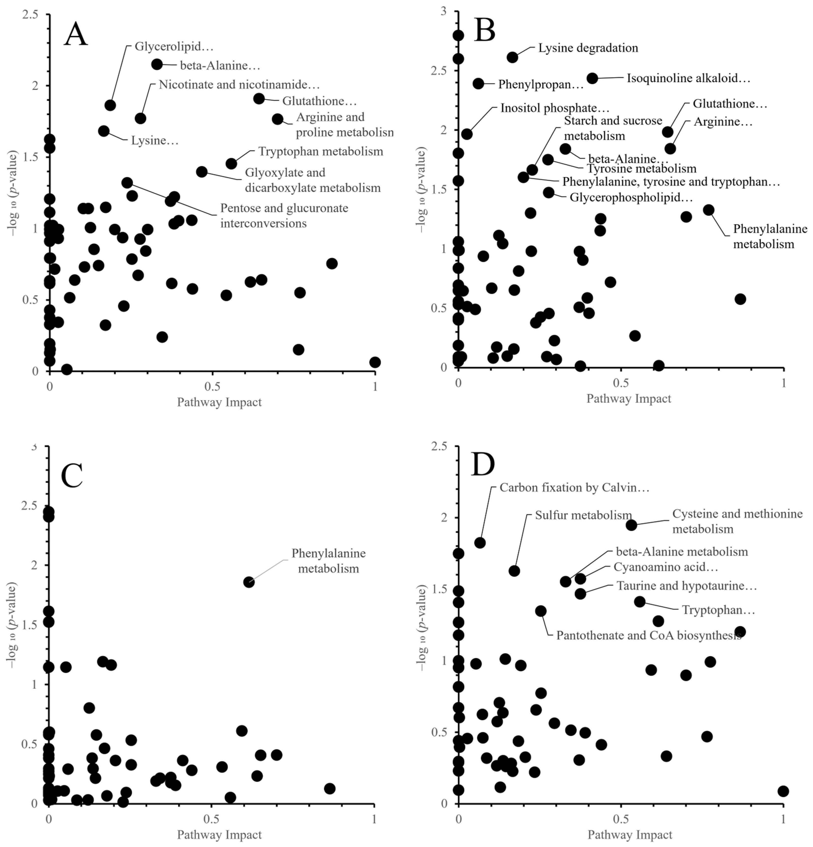 | Cyanoamino acid metabolism | 0.375 | 0.220 | 0.083 | 0.375 | 1.570 | 0.589 | −0.506 |