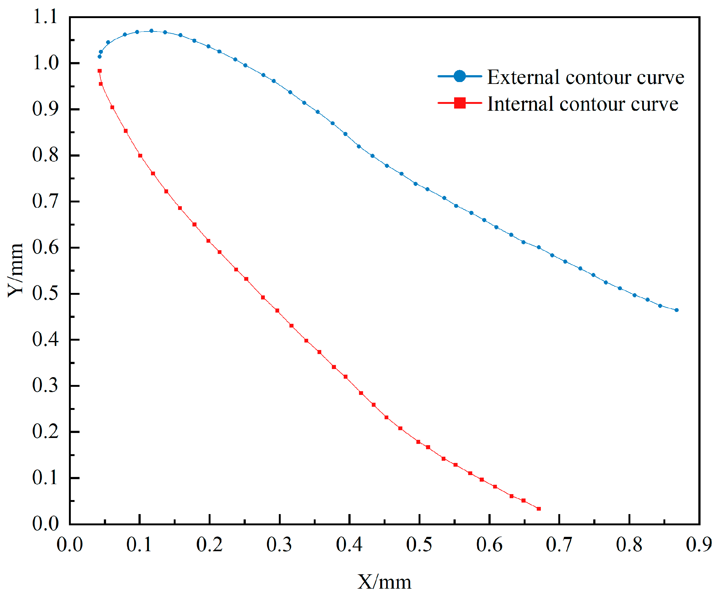 14], and the size ratio of the first toe contour of the forefoot is more similar to that of the film shovel. Therefore, the contour curve of the first toe of the mole cricket in North China is investigated in this study. There are some differences in the inner and outer contour of the toe; the inner side of the toe lands earlier and more directly contacts the soil. Therefore, the contour of the first toe is divided into inner and outer parts, and the fitting equation is obtained.