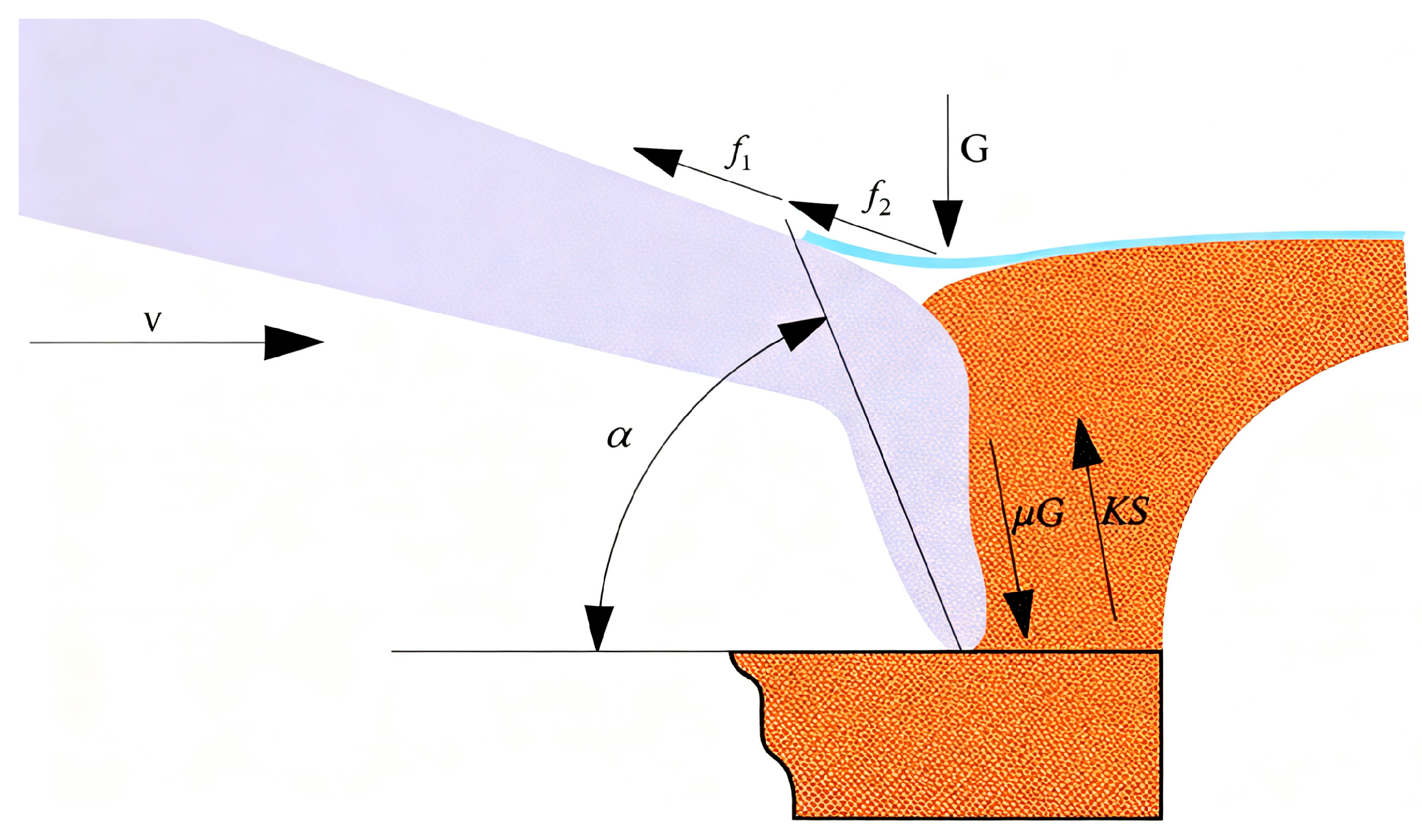 F—gravity of the film soil mixture above the film shovel, N; G—gravity of the film soil mixture above the film shovel, N; α—penetrating angle, °; K—soil adhesion, MPa; S—operating contact area, mm2; f1—the friction between the film shovel and the film, N; f2—the friction between the film shovel and the film, N; μ—friction factor within the soil.