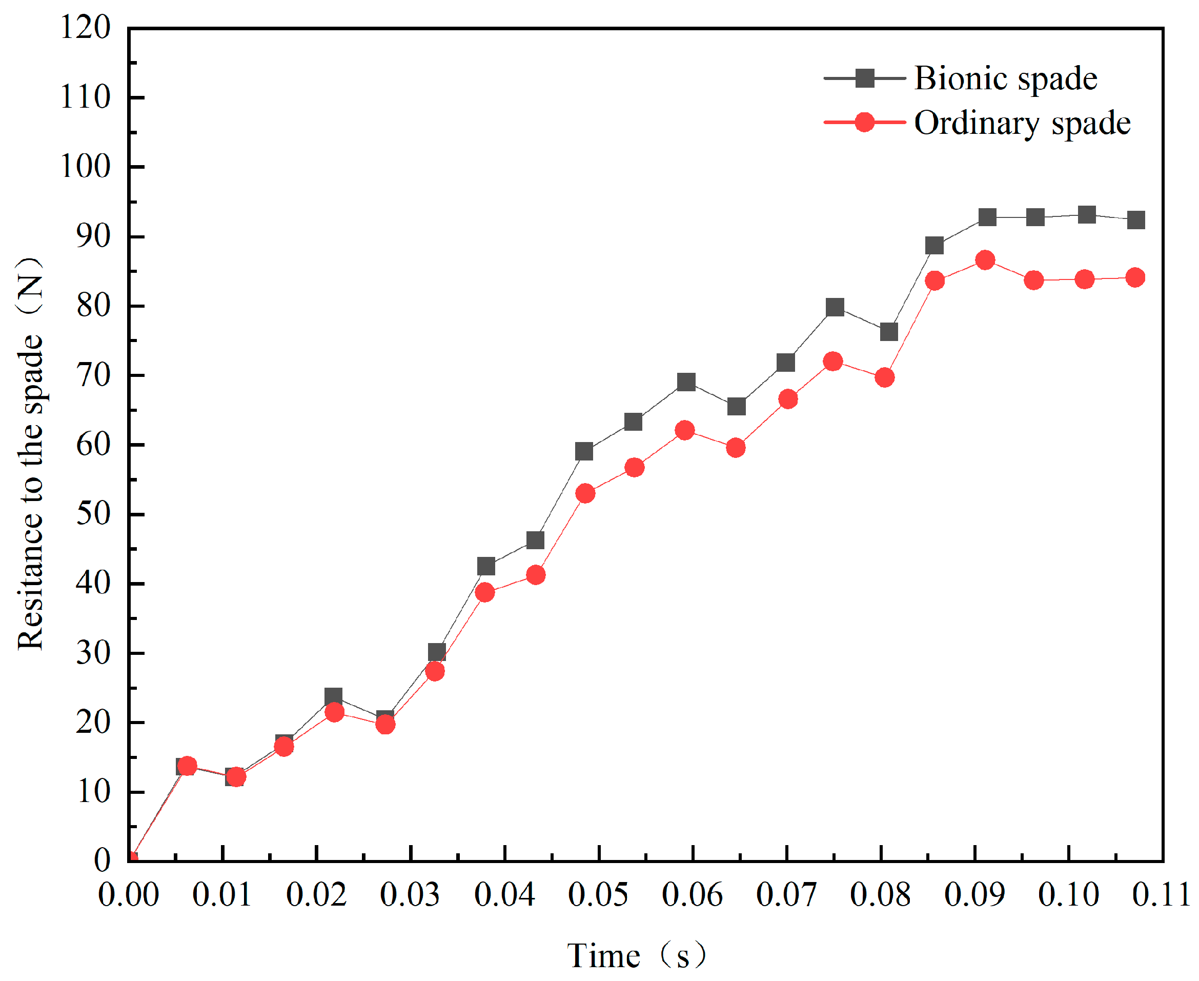 At 0.005 s, the film resistance starts at 0.02 s. The resistance of the film increases significantly and reaches 88.45 N. At the maximum resistance value at 0.08 s, the resistance value reaches the maximum of 80.23 N at 0.085 s. In comparison, the resistance reduction rate of the bionic film shovel is 9.3%.