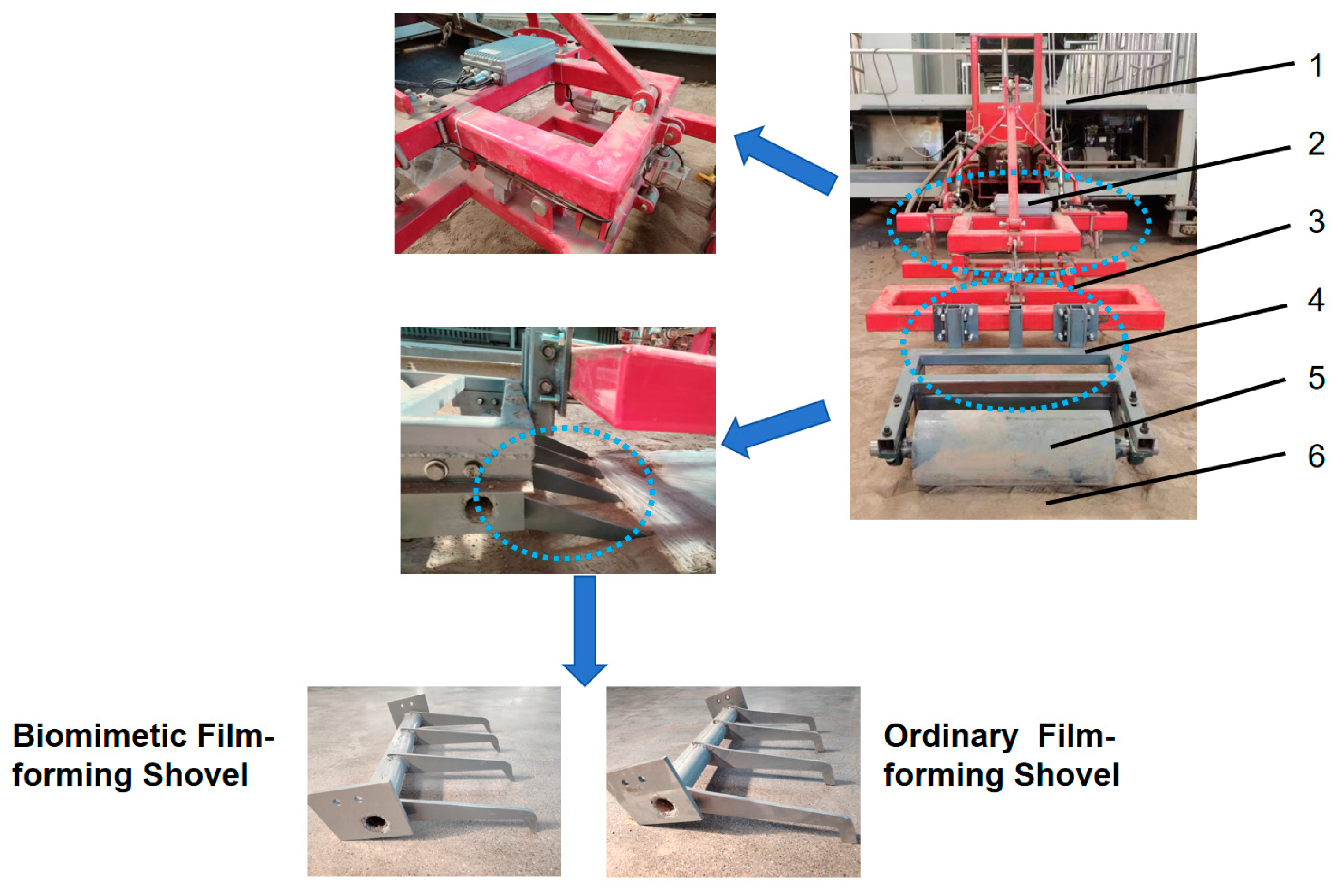 (3) Soil trench tests were conducted to compare the film-forming effects of two types of shovel teeth. The results showed that the soil accumulation phenomenon and film-forming resistance generated by the biomimetic shovel teeth during simulation tests were significantly better than those generated by conventional shovel teeth. Film-forming resistance was measured using a triaxial force sensor and it was found that the average resistance of the biomimetic blades was 411.49 N, compared to 454.70 N for conventional blades, representing a reduction of 9.5%. This is nearly identical to the 9.3% reduction observed in the simulation test, confirming the reliability of the established LS-DYNA model. The biomimetic film-forming blades had an average film lifting rate of 94.02%, which was 4.24% higher than that of conventional blades. The film-forming efficiency of the biomimetic scraper was higher than that of the conventional scraper. The biomimetic film-forming scraper’s structural design is reasonable and meets the drag reduction requirements for film-forming operations involving residual film recovery.