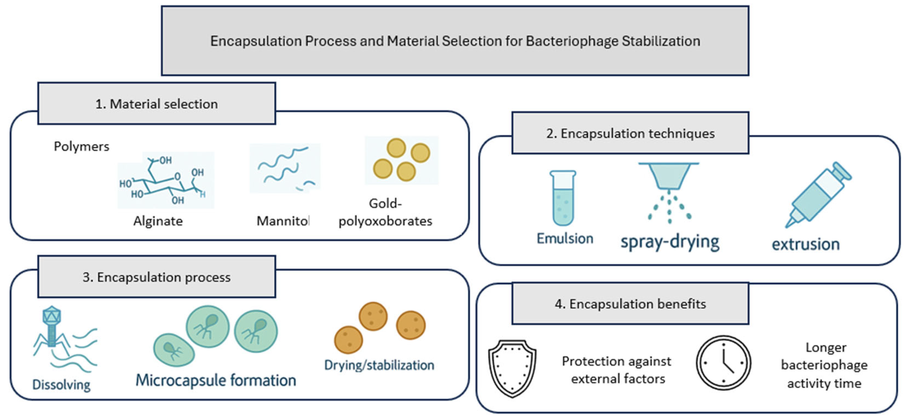 - Malik, D.J.; Goncalves-Ribeiro, H.; GoldSchmitt, D.; Collin, J.; Belkhiri, A.; Fernandes, D.; Weichert, H.; Kirpichnikova, A. Advanced Manufacturing, Formulation and Microencapsulation of Therapeutic Phages. Clin. Infect. Dis. 2023, 77, S370–S383. [Google Scholar] [CrossRef]