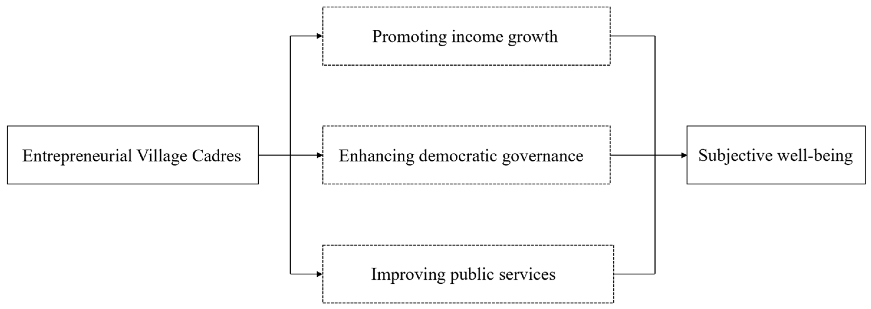 60]. Positioned between the government and local residents, the Party secretary is responsible for policy implementation, order maintenance, social mobilization, and public service delivery. Therefore, this study focuses on village Party secretaries as the unit of analysis to examine the effect of Entrepreneurial Village Cadres (EVCs) on rural residents’ SWB.