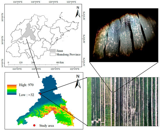 The Jiyang Experimental Demonstration Base of the Shandong Academy of Sciences (117°07′ E, 36°54′ N) is located in Dongsheng Village, Taiping Street, Jiyang District, where it serves as the site for collecting wheat powdery mildew leaves. This experimental base was specifically established for wheat powdery mildew research and is maintained under expert supervision by a team of plant pathologists specializing in cereal fungal diseases. Artificial inoculation was performed using Blumeria graminis f. sp. tritici, the causal pathogen of wheat powdery mildew, under controlled field conditions. Disease identification was jointly conducted by two experienced plant protection experts. The identification process relied on morphological features of lesions, the presence of white powdery fungal hyphae, and field-observed infection symptoms, ensuring high accuracy and consistency of the labeled data. The climate of the region is warm temperate, characterized by a semi-humid monsoon, with four distinct seasons that coincide with heat and rainfall, and an abundance of sunshine. Mild spring temperatures support wheat growth and development, while cold winters promote dormancy. Additionally, the region is suitable for using remote sensing technology to study wheat powdery mildew due to its flat topography, fertile soil rich in organic matter, and favorable agricultural conditions. The study area is represented in the figure below (Figure 1).