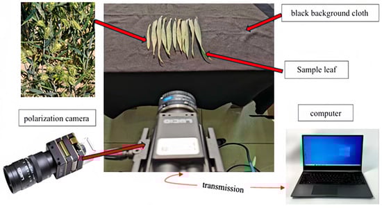 The imaging system consisted of a Phoenix polarization camera (LUCID Vision Labs, Richmond, BC, Canada) equipped with a micro polariser array (Sony, Tokyo, Japan) and a CMOS sensor (Sony, Tokyo, Japan), ensuring precise polarization measurements. The system was carefully calibrated before data acquisition. This included polarimetric calibration, which utilized linearly polarized light at 10-degree intervals to verify the sensor’s response accuracy and extinction ratio, flat-field correction, which employed a uniform diffuse reflectance standard to normalize pixel response variations, and dark-frame subtraction to eliminate sensor noise. Specifically, the system used a PHX050S-P camera (LUCID Vision Labs, Richmond, BC, Canada fitted with a SONY IMX250MZR CMOS (Sony, Tokyo, Japan) sensor. The sensor provides a resolution of 2448 × 2048 pixels with a pixel size of 3.45 μm and supports multi-angle polarization detection (0°, 45°, 90°, and 135°) through its integrated micro-polariser array. At a wavelength of 500 nm, it achieves an extinction ratio greater than 300:1, ensuring high-quality polarization measurements mainly within the visible spectrum (400–700 nm). Focusing on this spectral range is beneficial since polarization effects and disease symptoms are typically apparent in visible wavelengths, making identification and analysis more accurate. To minimize external interference and enhance image stability, the camera was securely mounted on a fixed stand, maintaining a perpendicular optical axis relative to the leaf surface. This setup effectively eliminated angular deviation, reducing errors caused by misalignment. A balanced light source was used to ensure consistent image quality. The leaves were carefully arranged on a black background cloth to allow full unfolding and avoid overlap. The black background enhanced contrast along leaf edges, facilitating subsequent image processing. Image analysis was conducted using MATLAB (R2024a) to extract relevant features and quantify the polarization characteristics.
