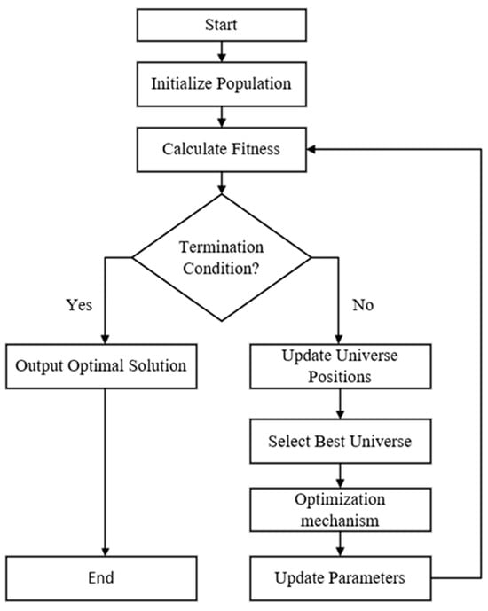 - Iteration and Update: If the maximum number of generations is not yet reached, the population is updated using MVO’s black hole and boundary control mechanisms to generate new candidates. This cycle continues until the convergence criteria are met.