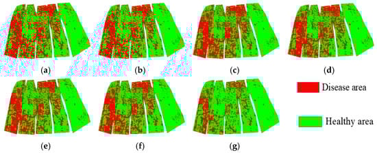Visualization of different identification classification algorithms, including red disease zone and green healthy zone: (a) MVO_RF; (b) RF; (c) NB; (d) SVM; (e) MLP; (f) ANN; and (g) KNN.