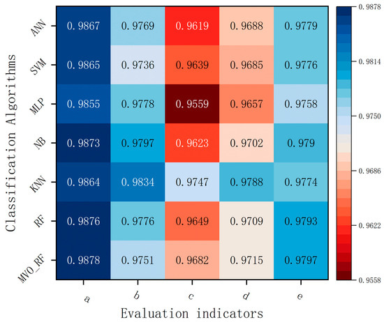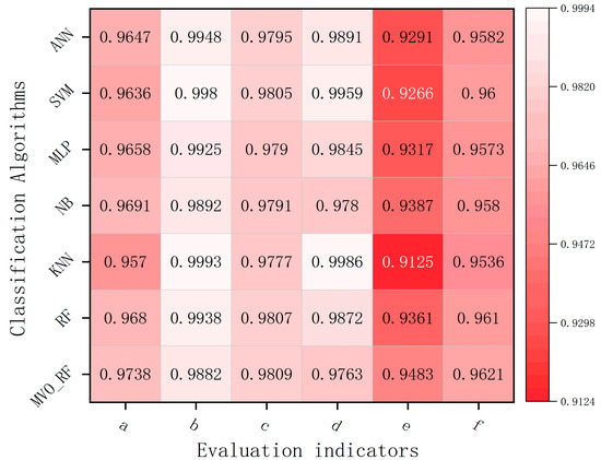 To evaluate the effectiveness of the MVO_RF algorithm in recognizing and identifying wheat powdery mildew using polarimetric images, this study compares its performance with that of six traditional machine learning models. To ensure rigorous performance evaluation and prevent overfitting, 10-fold cross-validation was applied to the dataset. The data were randomly partitioned into 10 folds, maintaining the original class distribution. For each iteration, the model was trained on 90% of the data and tested on the remaining 10%. The results were averaged across all folds. Five metrics—F1 score, recall, accuracy, precision, and Kappa coefficient—were used to assess the classification performance of MVO_RF. This method ensures that the reported results are not inflated due to data leakage and aims to determine the most effective approach for identifying powdery mildew in a comparative setting.
