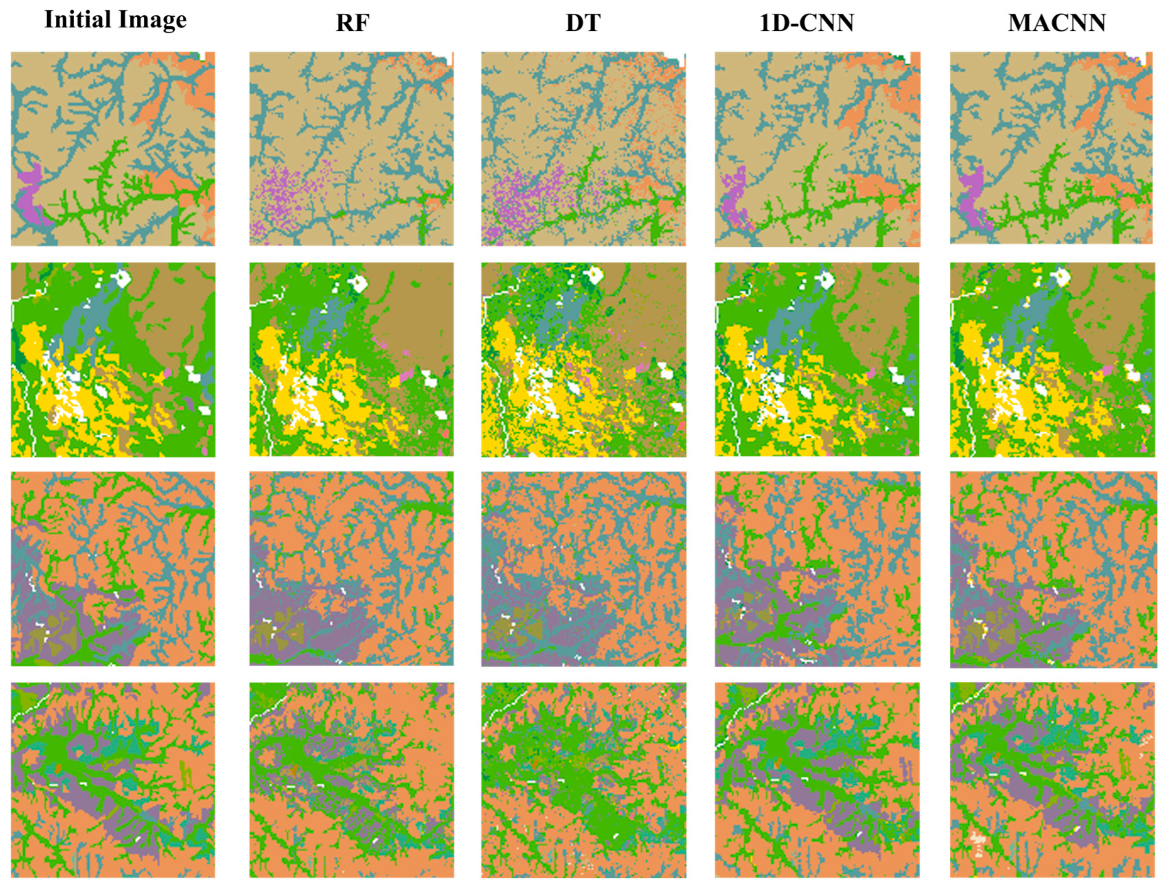 - A comparative analysis of the classification results of the MACNN algorithm against RF, DT, and 1D-CNN, based on classification accuracy evaluation metrics, was conducted. The results indicate that the MACNN algorithm achieved a substantial improvement in overall classification accuracy. Specifically, MACNN attained an overall classification accuracy of 81.27%, which represents an increase of 7.65%, 13.51%, and 5.20% over the RF, DT, and 1D-CNN algorithms, respectively. Furthermore, its Kappa coefficient of 0.7681 showed respective increases of 0.0917, 0.1598, and 0.0685 compared to RF, DT, and 1D-CNN, thus demonstrating higher classification accuracy and a better ability to represent the spatial distribution of soil types.