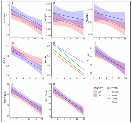 Soil Chemistry Seasonal Dynamics. Key edaphic variable responses to switchgrass planting density (high-density planting—HDP vs. low-density planting—LDP) across a growing season. Note that data are combined across all four switchgrass cultivars (Alamo, Bomaster, Colony, and Kanlow) as the cultivar effects were minimal except for soil pH (E). (A) Soil Organic Matter (SOM) % (B) Soil Total C% (C) Soil Total N% (D) Soil pH (E) Soil pH (F) Soil C:N ratio (G) Soil P and (H) Soil K were sampled from one week after the first leaf emergence to the end of the growing season for a total of 38 weeks; x-axes are in log2 scale. The figures represent the linear mixed effect models with effects of time (continuous variable with six levels: 0—Week1, 1—Week2, 2—Week4, 3—Week8, 4—Week16, and 5—Week38), (categorical variable with four levels: Alamo, BoMaster, Colony, and Kanlow) and planting density (categorical variable two levels: HDP and LDP). Spatial “Block” was included as a random effect. Means and standard deviations are included in Table S1.