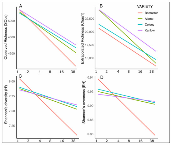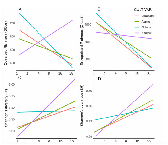 Temporal Dynamics of Bacterial Diversity in Soil. Soil bacterial richness and diversity responses to different switchgrass cultivars (Alamo, Bomaster, Colony, and Kanlow) across a growing season. Data are combined for the two planting densities (high-density planting—HDP and low-density planting—LDP), as only minimal planting density effects were observed. Soil samples were collected from one week after the first leaf emergence to the end of the growing season, spanning a total of 38 weeks, to assess (A) Observed richness (SObs), (B) Extrapolated Richness (Chao1), (C) Shannon’s diversity index (H’), and (D) Shannon’s evenness (EH). Results represent linear mixed-effects models accounting for time (continuous variable with six levels: 0—Week1, 1—Week2, 2—Week4, 3—Week8, 4—Week16, and 5—Week38), cultivar (categorical variable with four levels: Alamo, Bomaster, Colony, and Kanlow), and planting density (categorical variable with two levels: HDP and LDP). “Block” was included as a random effect to account for spatial variability.