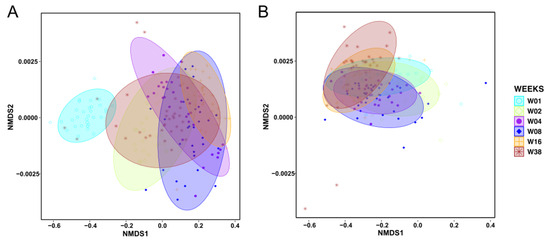 The Temporal Dynamics of Switchgrass Root and Soil Microbiome Composition. (A) NMDS ordination (stress = 0.19) of switchgrass root microbiomes across six sampling time points (Week 1, Week 2, Week 4, Week 8, Week 16, and Week 38). The ordination visualizes changes in bacterial community composition in the roots over time (visualized in colors and symbols) based on a Bray–Curtis distance matrix. (B) NMDS ordination (stress = 0.16) of switchgrass soil microbiomes at the same six sampling intervals (Week 1, Week 2, Week 4, Week 8, Week 16, and Week 38). The ordination visualizes temporal changes in microbiome composition in the soil, also derived from the Bray–Curtis distance matrix.