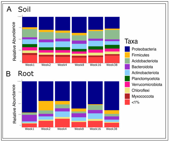 Temporal Dynamics of Bacterial Phyla in Root and Soil. Relative abundance of bacterial phyla in the switchgrass root and soil microbiomes. Data are combined across the four cultivars (Alamo, BoMaster, Colony, and Kanlow) and the two planting densities and presented over one growing season across six time points (Week 1, Week 2, Week 4, Week 8, Week 16, and Week 38). The figure illustrates the relative abundance of sequences assigned to bacterial taxa within the switchgrass (A) soils and (B) roots.