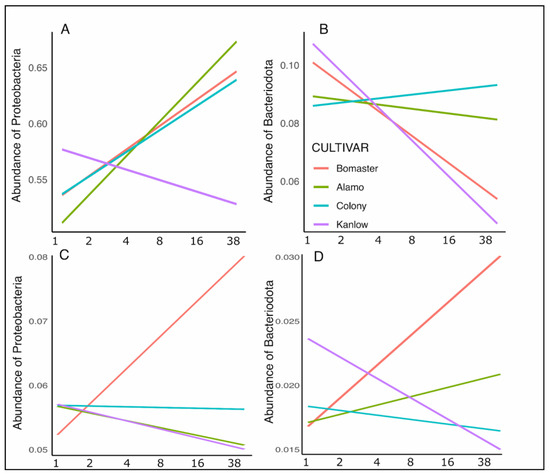 Consistent with our analyses of edaphic properties and microbiome diversity, the microbiome composition was also temporally dynamic. The root-associated microbiomes varied across the six time points, with the exception of weeks 4 and 8 that did not differ. This suggests that the root microbiome is compositionally sensitive to temporal changes, and potentially driven by fluctuations in root exudates, nutrient availability, and plant development [99,107,117]. In contrast, the soil microbiomes were less variable and differed only between the early (weeks 1–8) and late (weeks 16 and 38) season. Notably, weeks 2 and 4 were an exception and differed from each other, possibly because of transient environmental factors or plant developmental changes. To further explore which broadly inclusive taxa attributed to the observed temporal dynamics in the roots and soil microbiome, we analyzed the nine phyla in roots (Proteobacteria, 57%; Bacteroidota, 8.1%; Firmicutes, 8.3%; Actinobacteriota, 7.7%; Acidobacteriota, 6.3%; Chloroflexi, 2.5%; Myxococcota, 2.6%; Planctomycetota, 2.0%; Verrucomicrobiota, 2.0%) (Table S16) and nine phyla in soil (Proteobacteria, 29.6%; Acidobacteriota, 16.6%; Actinobacteriota, 10.9%; Planctomycetota, 5.7%; Verrucomicrobiota, 5.7%; Chloroflexi, 5.4%; Bacteroidota, 5.3%; Firmicutes, 4.2%; Myxococcota, 3.4%) (Table S15) present in relative abundances greater than 1% using the mixed effect models we used for our analyses for richness and diversity. These analyses revealed that the relative abundances of Proteobacteria in the roots increased as the growing season progressed. The temporal decline of Bacteroidota interacted with the switchgrass cultivars (P = 0.021), such that the decline was particularly pronounced in the cultivar Kanlow (Figure 7A,B). The Proteobacteria and Bacteroidota were also temporally dynamic in soil, and both had interaction effects with cultivars (P < 0.05) (Figure 7C,D). While Kanlow had the most pronounced decline over the season, both taxa increased in abundance over time with the Bomaster cultivar. This is in line with our speculation that Kanlow and Bomaster differ in their root metabolites and exudates. These metabolites and exudates potentially selectively promote specific bacteria, highlighting the cultivar-specific effects on the associated microbiomes.