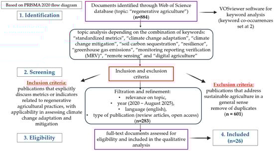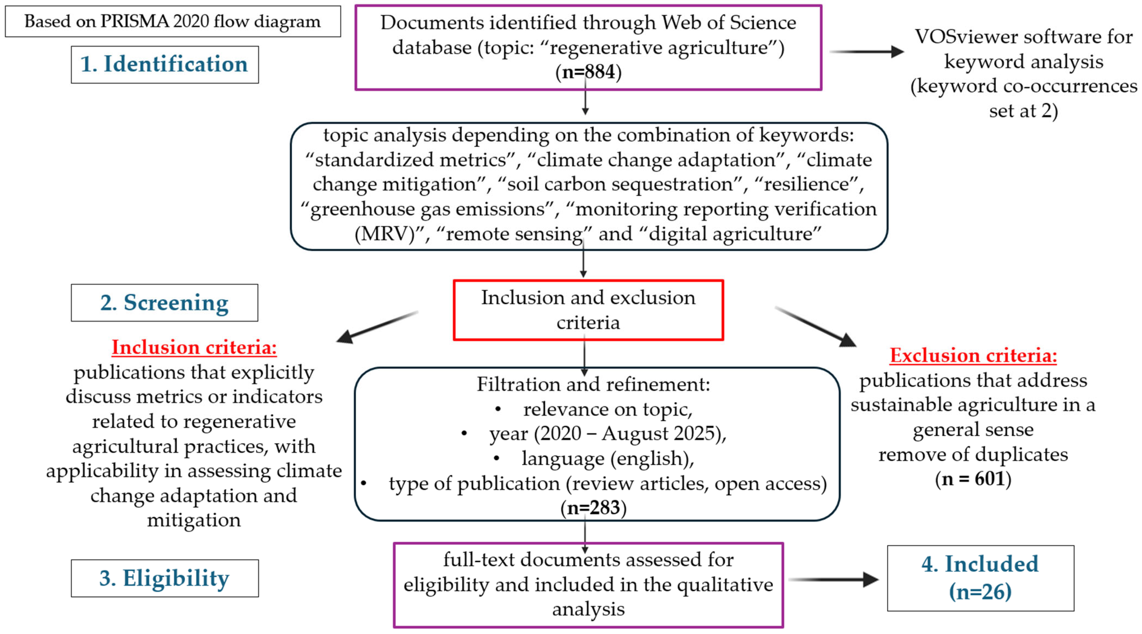 The search strategy used a combination of keywords such as “regenerative agriculture”, “standardized metrics”, “climate change adaptation”, “climate change mitigation”, “soil carbon sequestration”, “sustainable agriculture”, “resilience”, “greenhouse gas emissions”, “monitoring reporting verification”, “remote sensing” and “digital agriculture”. The terms were combined using logical operators to maximize the relevance of the results, for example “regenerative agriculture AND standardized metrics OR climate change”. To maintain the coherence of the analysis framework, only peer-reviewed and open access articles that explicitly discuss metrics or indicators related to regenerative agricultural practices, with applicability in assessing climate change adaptation and mitigation, were included. Publications that address sustainable agriculture in a general sense, without direct references to standardized metrics or comparable assessment tools, were excluded. The selection process involved a first stage of filtering in relation to summaries, followed by full reading of documents to confirm relevance. Selected articles were then classified thematically, by categories of metrics associated with adaptation, mitigation or socio-economic dimensions, with a focus on the degree of standardization and applicability in different regional contexts. To ensure the accuracy and transparency of the process, the selection flow was summarized in a PRISMA diagram briefly showing the methodology steps for the studies incorporated in the analysis (Figure 3).