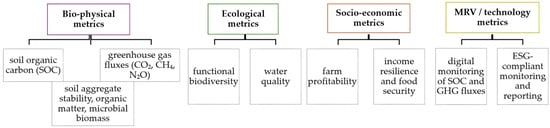 In regenerative agriculture, metrics are not just numbers, but vital tools that tell us whether changes are actually working. At the same time, they are a direct reflection of how this agricultural model reshapes ecosystems and local economies and contributes to combating climate change (Figure 6). Measuring the performance of regenerative agriculture requires a coherent set of metrics that reflect both biophysical processes (such as soil carbon stocks and flows), ecological impacts (diversity, soil health, water quality) and socio-economic outcomes (productivity, costs, financial resilience). Recent studies suggest that fundamental metrics include soil organic carbon (SOC) content and its dynamics over clearly defined time windows, greenhouse gas fluxes (CO2, CH4, N2O) per unit of output or hectare, soil health indicators (organic matter, aggregate stability, microbial biomass), functional biodiversity metrics, and economic indicators that assess on-farm cost-benefit. These elements are recognized as priorities for MRV and integration into Environmental, Social, Governance (ESG) reporting, as they allow for comparability across practices and locations, the assumption of additionality, and the estimation of permanence of carbon sequestration [,,,,].
