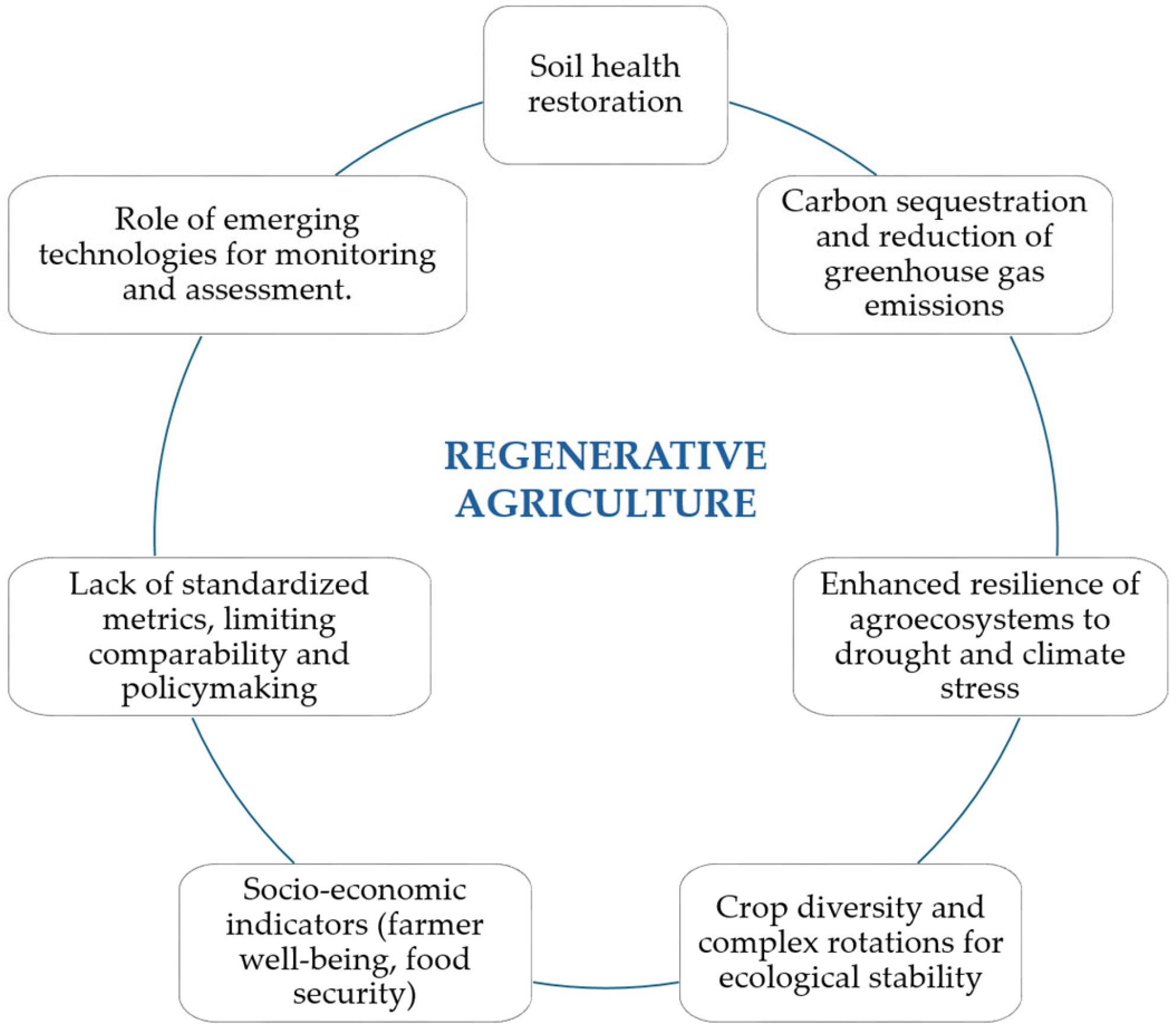 Regenerative agriculture brings together a set of agroecological practices aimed at restoring soil ecosystem functions and strengthening farm resilience. Among the most widely used are diversified crop rotations, reduced mechanical tillage, green crops, legume integration and agroforestry, all of which contribute to increasing soil organic carbon (SOC) and improving biodiversity. In order to assess the results of their implementation, standardized methods and indicators have been developed, such as organic carbon content, greenhouse gas emission balance, soil fertility, water use efficiency or farm profitability [,,,,]. Regenerative agriculture (Figure 1) has thus become a remarkably dynamic operational and research framework; however, its impacts remain difficult to compare across regions and practices due to the absence of a coherent set of standardized metrics and methodological variation in study design and reporting [,,,]. As a result, quantitative syntheses and policy assessments suffer from a lack of interoperability of indicators, and conclusions on the real capacity for adaptation and mitigation are often contingent upon the choices of measurement and observation periods. This fundamental issue is being increasingly highlighted, which calls for a shift from disparate inventories to robust, replicable, and transparent monitoring, reporting, and verification frameworks [,].