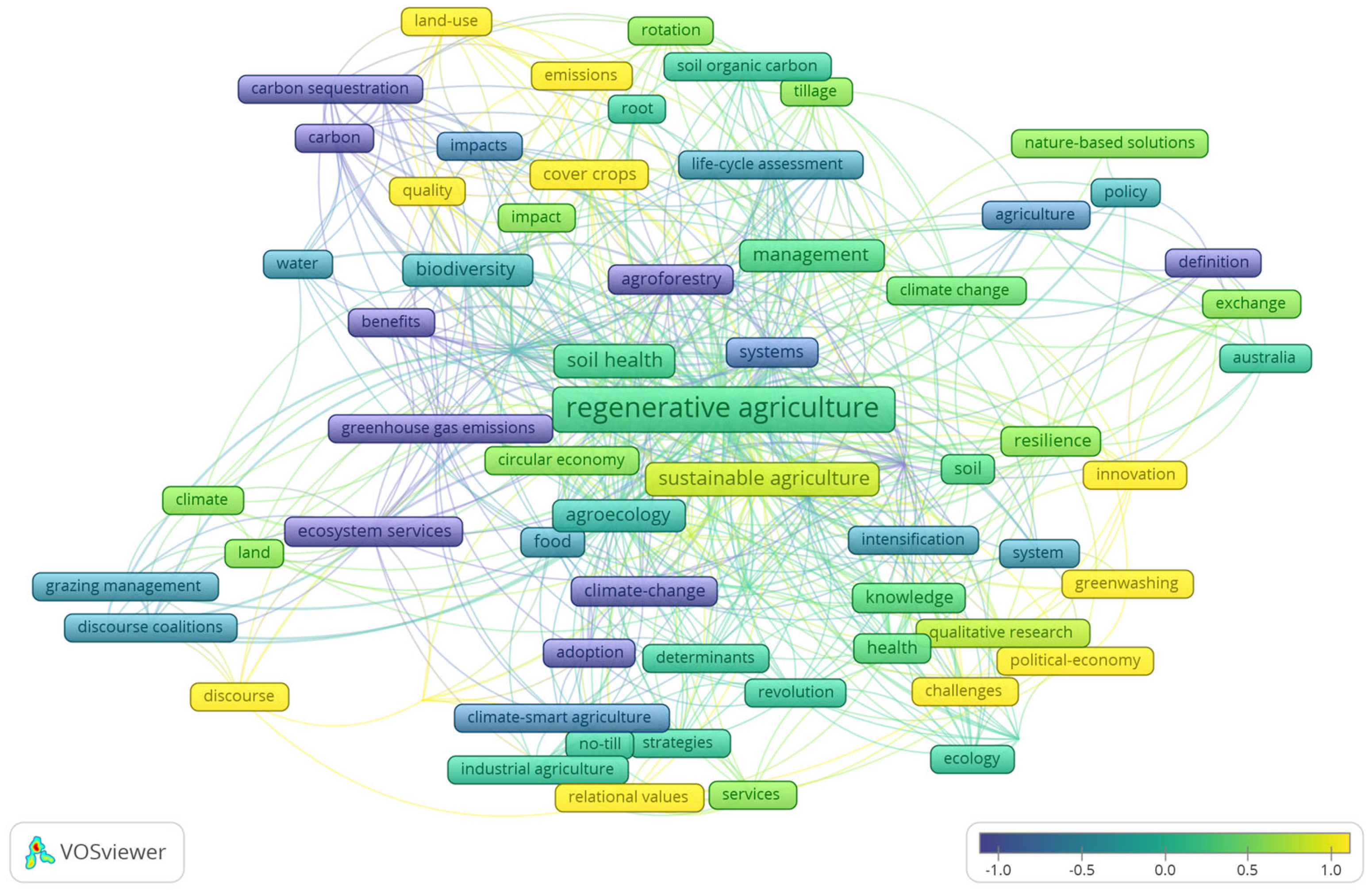 The research methodology approached for the systematic review was built according the PRISMA framework []. The process aimed to ensure transparency, reproducibility and comprehensive coverage of relevant sources, with a focus on the literature published between 2020 and 2025 in prestigious journals indexed in international databases. The selection was based on the Web of Science database (accessed on 27 August 2025), which concentrates a large part of recent publications on regenerative agriculture and climate change. The search topic was based on aspects related to “regenerative agriculture”. The search yielded a total of 884 publications. Results were processed using VOSviewer (version 1.6.20) to perform the keyword analysis, with a minimum co-occurrence threshold of two set for keyword selection (77 results) (Figure 2). The threshold of at least two co-occurrences was selected to ensure a balance between thematic relevance and network clarity, avoiding excessive overlap of rare or isolated terms. Figure 2 illustrates the keyword co-occurrence network, highlighting the main thematic cores associated with regenerative agriculture, agroecological practices and soil management, sustainability assessment and monitoring metrics, climate adaptation and emission reduction, as well as socio-economic dimensions and supporting policies.