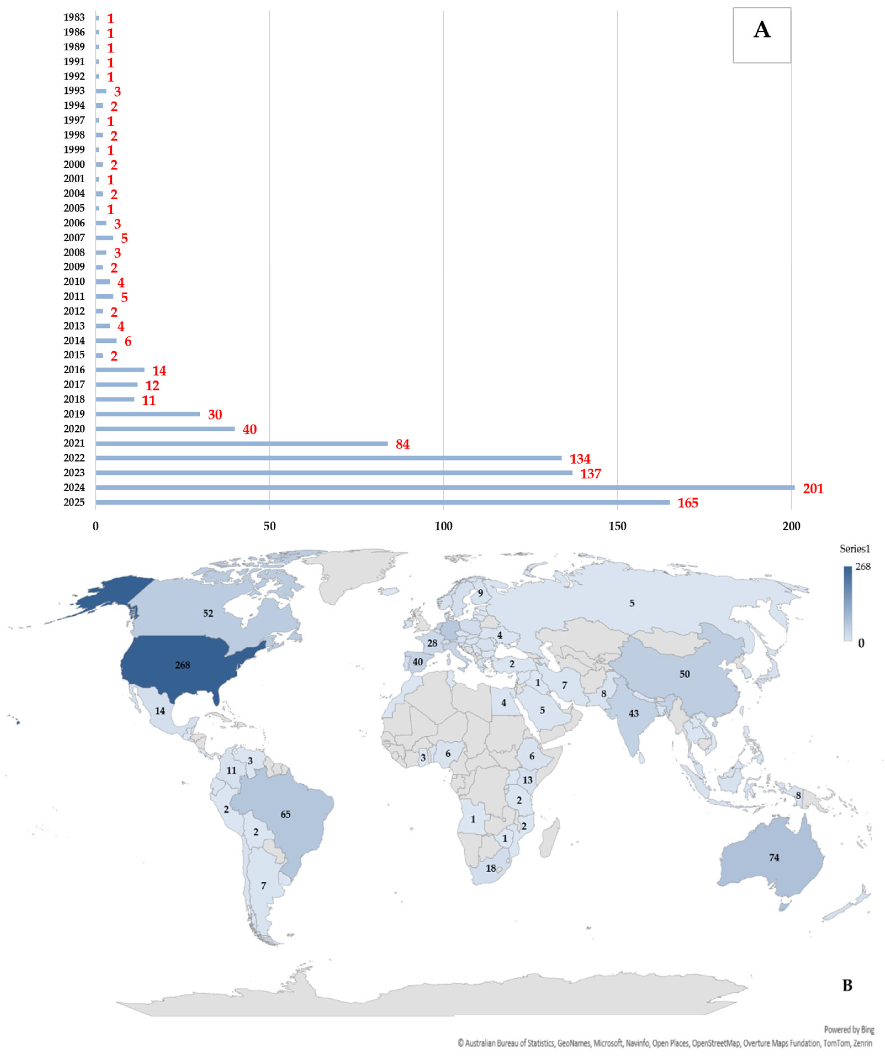 Temporal and spatial distribution of publications related to regenerative agriculture; (A): publications since the first use of the term of regenerative agriculture; (B): global distribution of the attempts to transition to sustainable agriculture (author-generated).