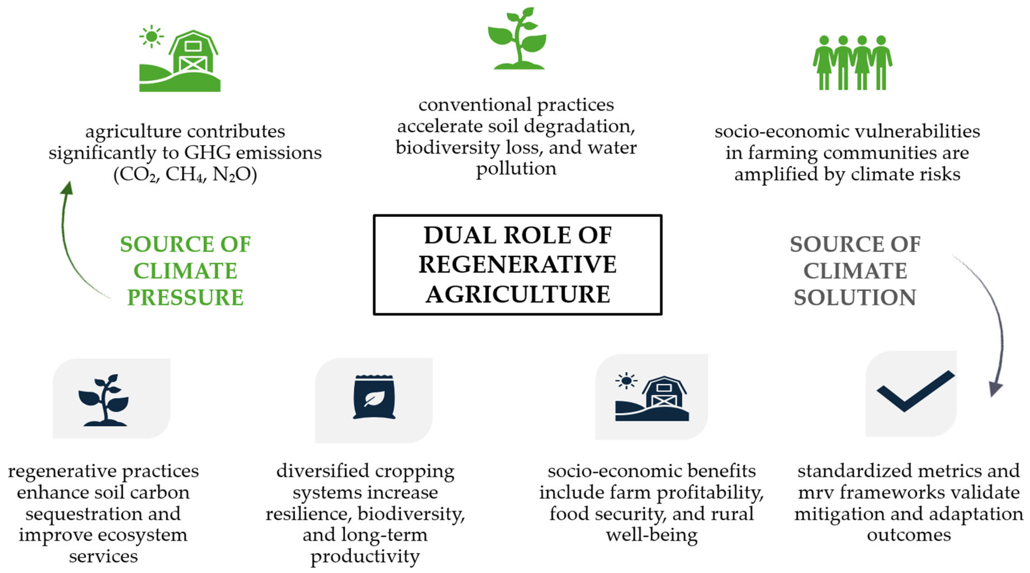 In light of recent research, the dual role of agriculture in the climate crisis is becoming the central element of academic and policy debate. On the one hand, conventional agricultural systems continue to be major sources of GHG emissions, the degradation of soils and the loss of biodiversity; on the other hand, by adopting regenerative practices, agriculture holds the capacity to become an essential tool in the context of adaptation and mitigation strategies, actively contributing to carbon sequestration, restoring natural capital and strengthening the resilience of rural communities. This duality is not an irreconcilable paradox but a starting point for understanding that the transition depends on the ability to replace harmful practices with regenerative solutions, validated by scientific evidence and quantified by standardized metrics. Thus, the integration of regenerative agriculture into global climate strategies requires not only a recognition of this dual role, but also a systematic effort to develop and harmonize indicators that can credibly measure both negative contributions and emerging benefits. Only through a robust monitoring, reporting and verification framework can agriculture be ensured to move from a structural problem to a strategic solution. Consequently, its dual role should not be seen as a contradiction, but as an opportunity for transformation, from a sector traditionally perceived as vulnerable and polluting to an essential vector of the green transition and long-term sustainability.