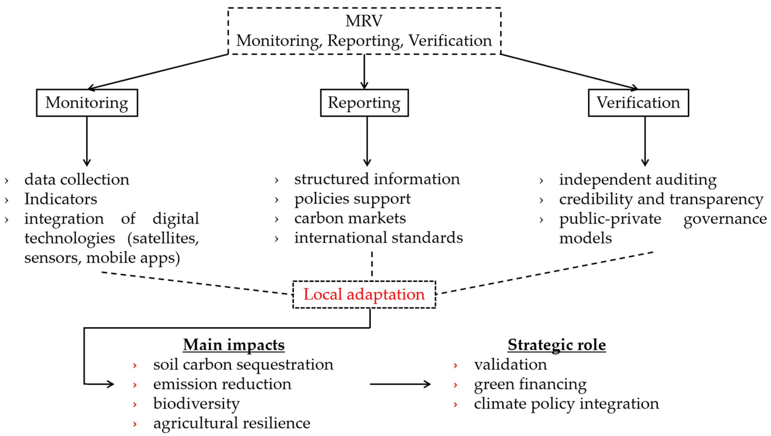 In the absence of a robust MRV framework, regenerative agriculture risks remaining a theoretical promise, lacking the necessary tools to validate real-world impacts. MRV thus emerges as an essential mechanism for quantifying the measurable effects of regenerative practices on soil carbon sequestration, emission reduction, maintaining ecosystem health, and strengthening agricultural resilience (Figure 8). From this perspective, monitoring provides raw data and relevant indicators, reporting integrates and standardizes information in a form usable for public policies and carbon markets, and verification ensures the credibility and transparency of the entire process [,].