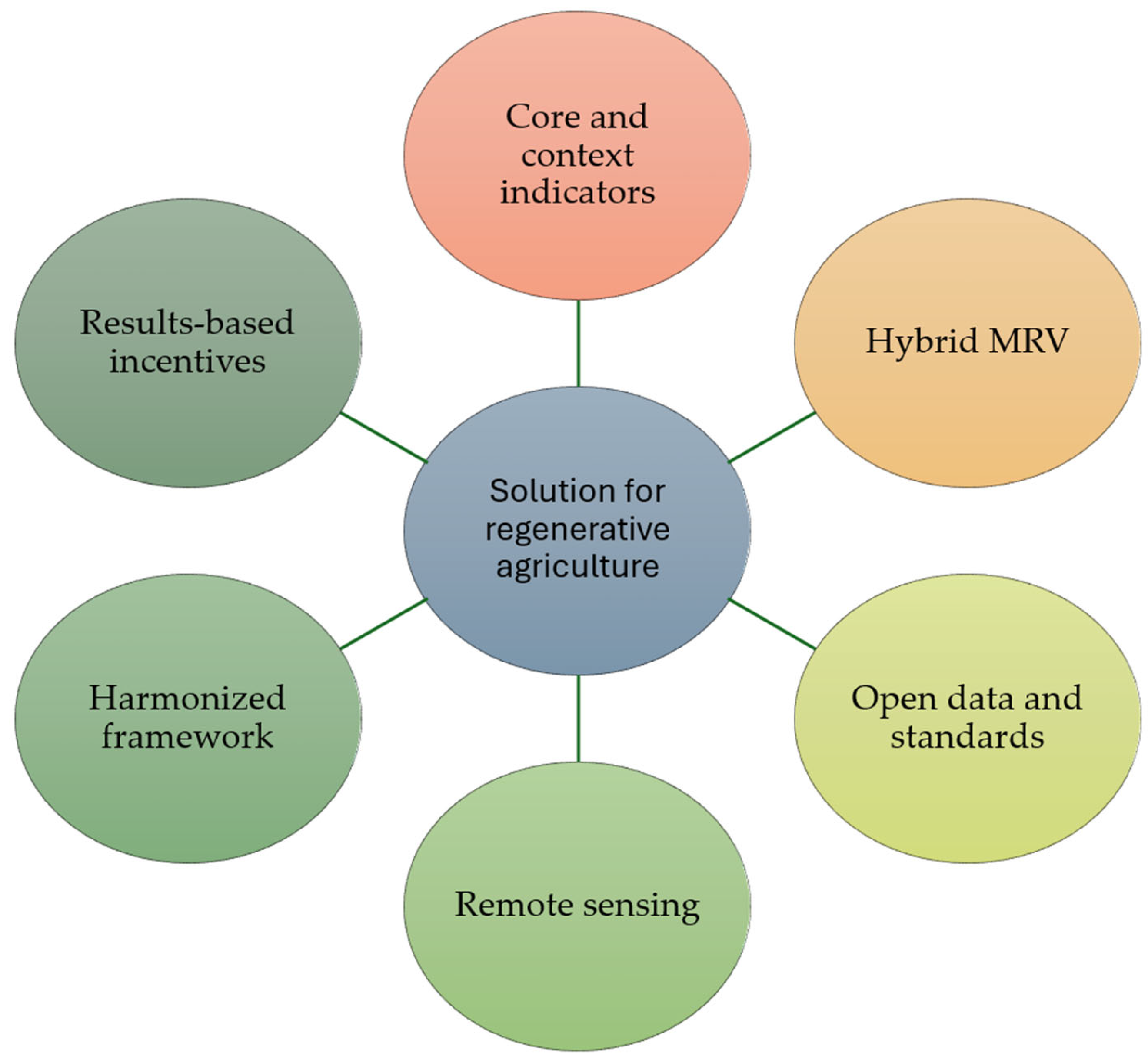 Unifying measurement methods in regenerative agriculture requires solutions that simultaneously address soil–climatic variability, monitoring costs, and credibility requirements in value chains and carbon markets (Figure 10). An effective approach is to move from fixed sets of indicators to a minimum core of outcomes (such as soil organic carbon dynamics, aggregate stability, water retention, and soil biodiversity), complemented by locally adapted indicators, established through thresholds and benchmarks from extensive regional databases. This flexibility increases the relevance and comparability of measurements across contexts [,,,].