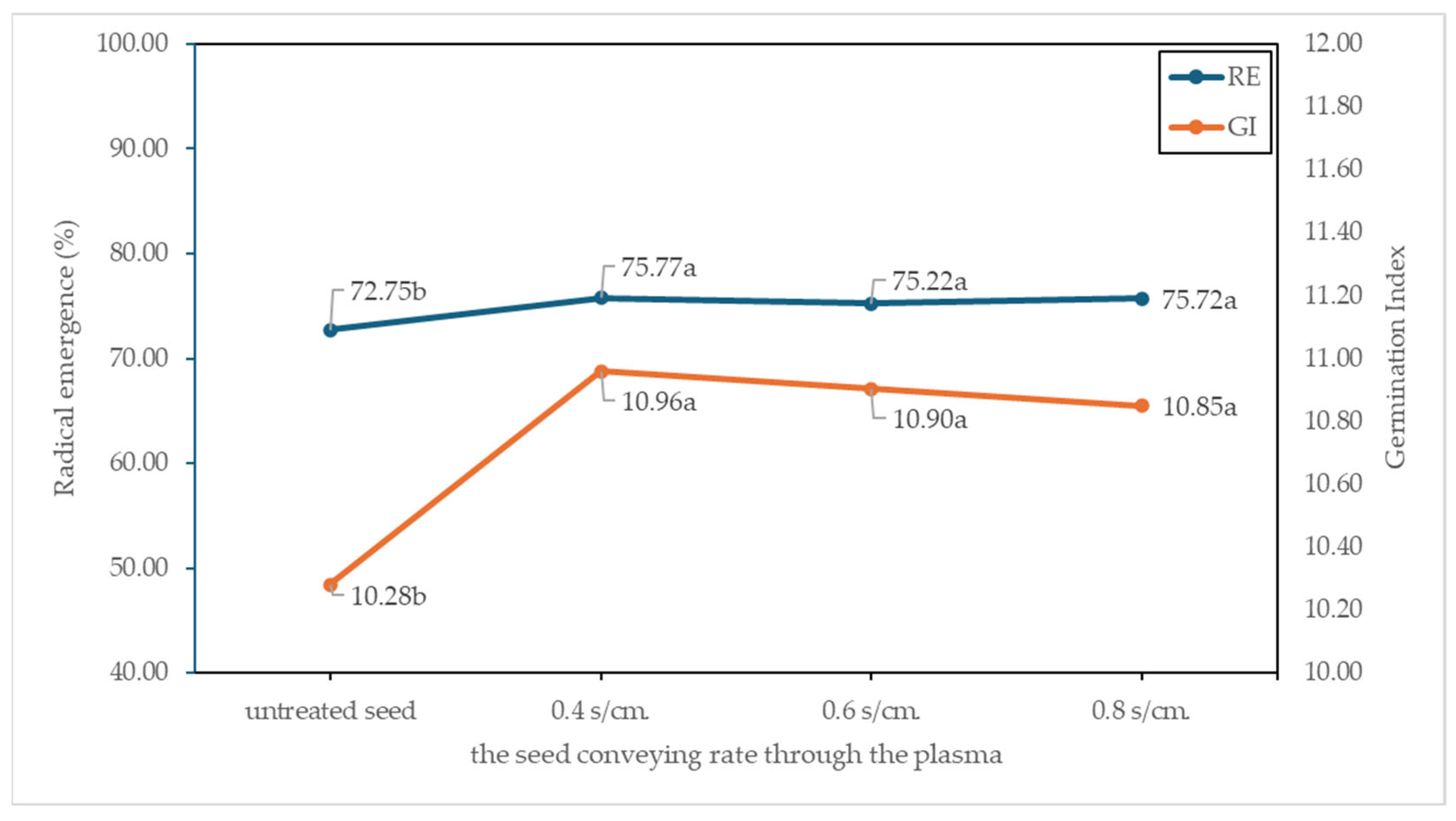 | Seed conveying rate through the plasma (B) | 3 | 33.45 * | 36.15 | 1.57 * | 1.53 * | 2.24 | 0.94 | 4.83 |