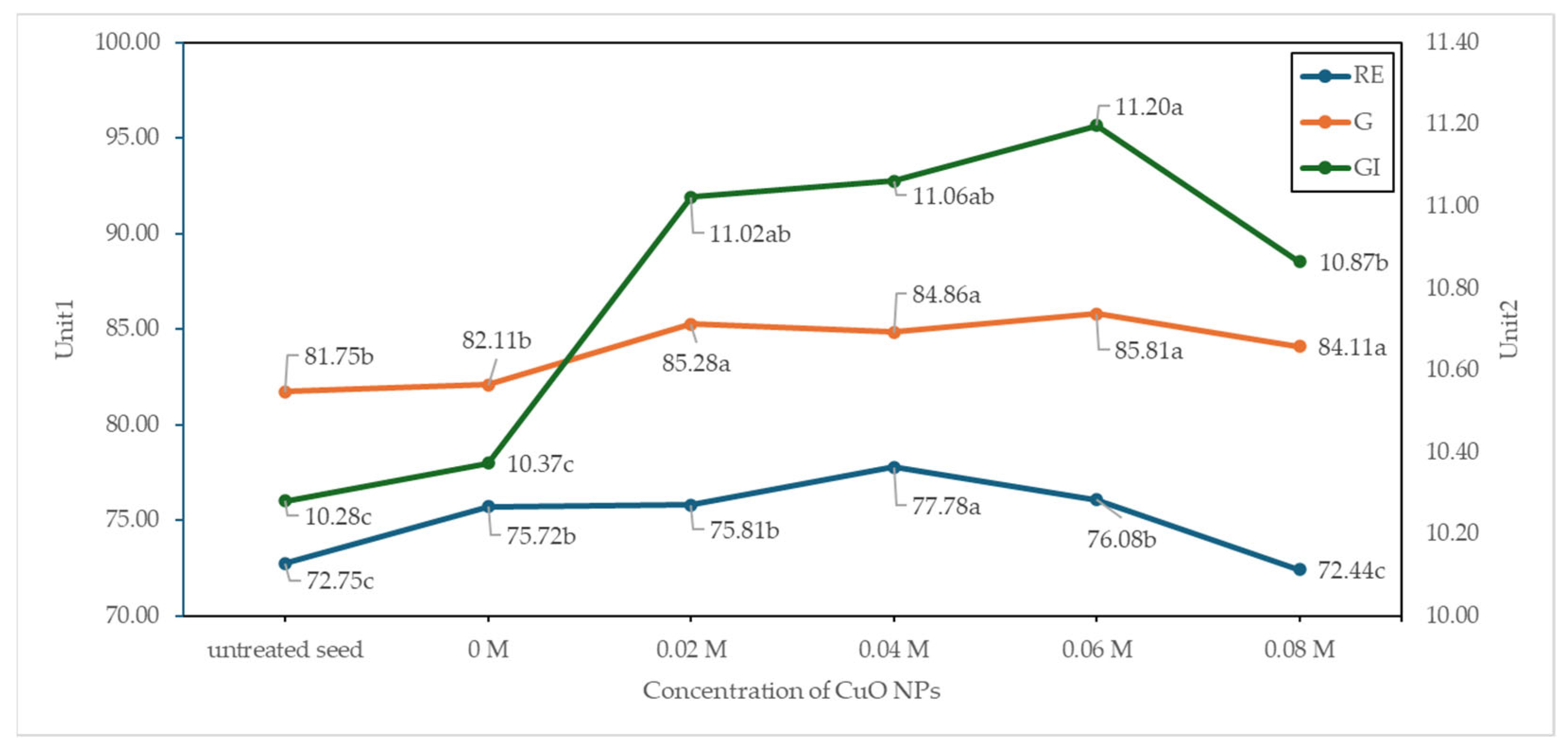 - Faraz, A.; Faizan, M.; Rajput, V.D.; Minkina, T.; Hayat, S.; Faisal, M.; Alatar, A.A.; Abdel-Salam, E.M. CuO Nanoparticle-Mediated Seed Priming Improves Physio-Biochemical and Enzymatic Activities of Brassica Juncea. Plants 2023, 12, 803. [Google Scholar] [CrossRef]