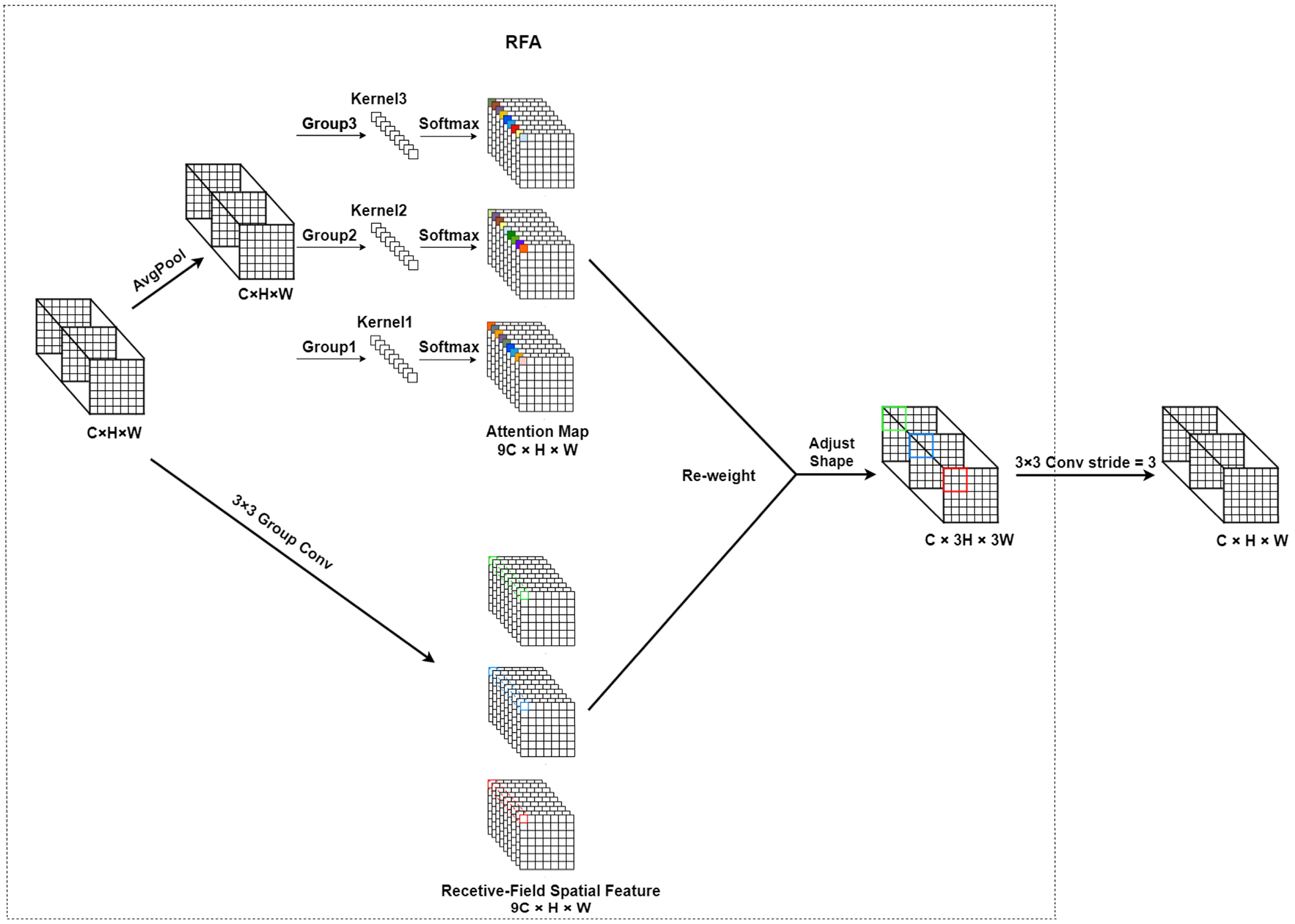 30] is introduced in this study. By incorporating receptive-field attention (RFA), RFAConv refines feature weighting across different spatial locations, enabling more effective feature discrimination while requiring only minimal additional parameters and computational overhead. The operating mechanism of RFAConv is shown in