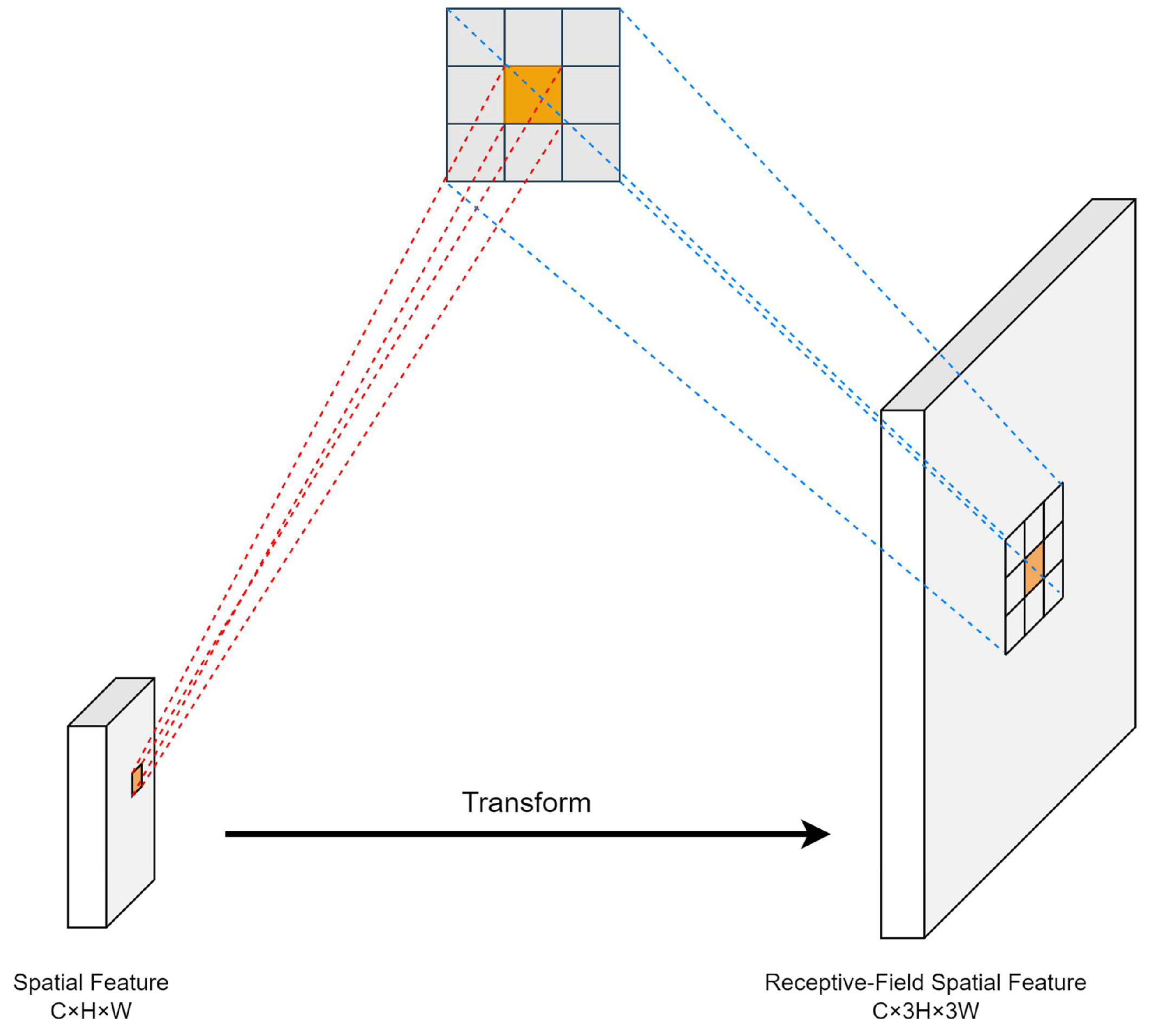 Figure 8. Considering a 3 × 3 convolution kernel, the spatial features correspond to the features extracted from the original input feature map, while the receptive-field spatial features represent the features obtained after applying receptive-field-aware attention. These transformed features are derived through multiple non-overlapping sliding windows, each corresponding to a 3 × 3 region, aligned with the receptive field utilized during convolution.