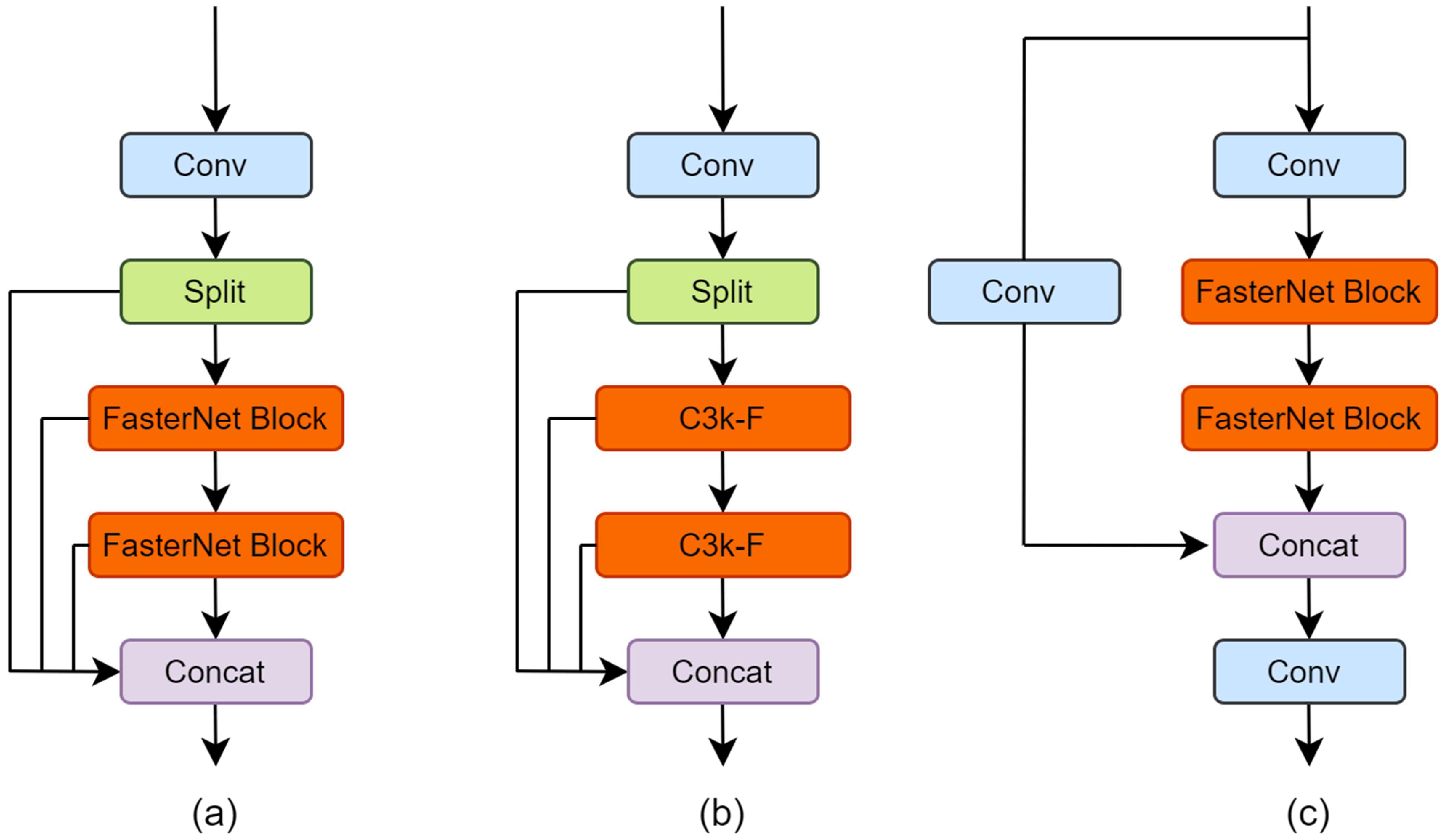Figure 10b, consists of a PConv and two 1 × 1 standard convolutions. It also employs a shortcut connection to facilitate the reuse of input features. Normalization and activation layers are used only after the middle 1 × 1 standard convolution, both preserving feature diversity and achieving lower latency. This study named the proposed feature extraction module C3k2-Faster, and its structure is shown in