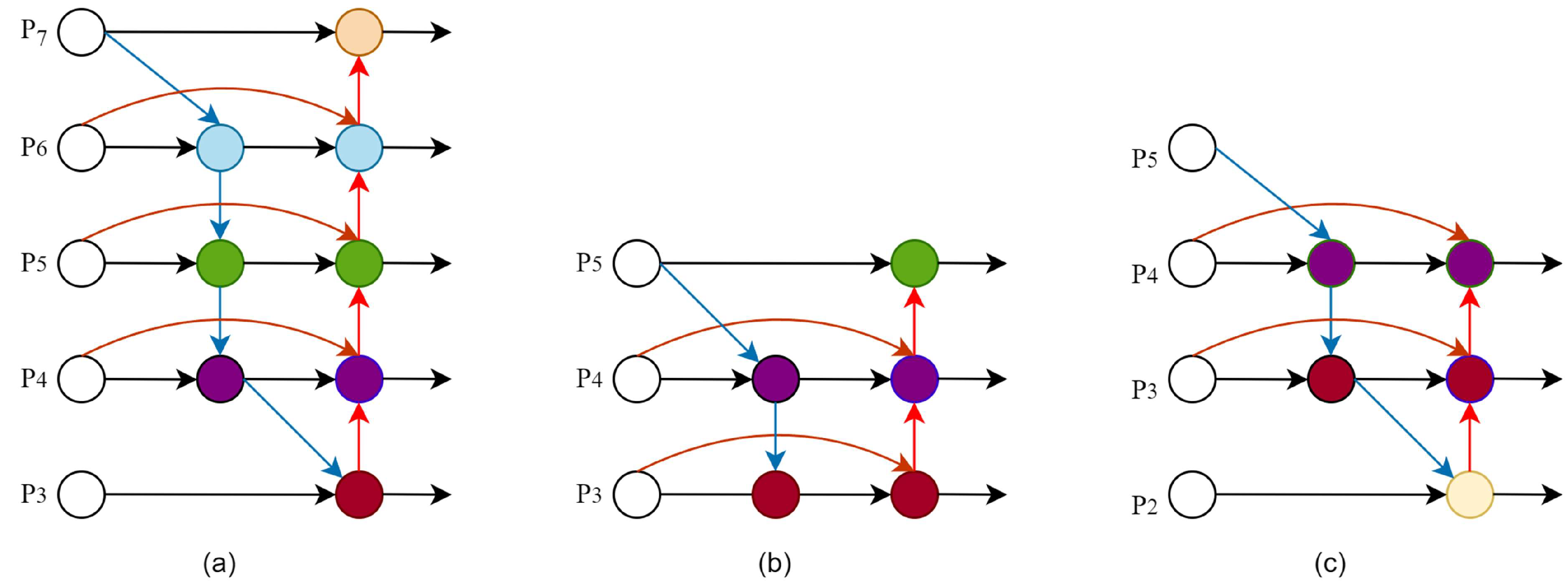 Figure 13b. Feature fusion among the P3–P5 layers generally meets the requirements of large-scale object detection. However, for kiwiberry flower and bud detection, the targets are small, densely distributed, and structurally subtle, making P3–P5 fusion alone insufficient for capturing fine spatial details. To alleviate this limitation, an improved BiFPN is introduced, which extends the fusion pathway to include the P2 layer while retaining multi-scale semantic integration from P2–P5. The P5 layer remains part of the feature fusion process but is no longer directly connected to the detection head. The architecture of the improved BiFPN is illustrated in