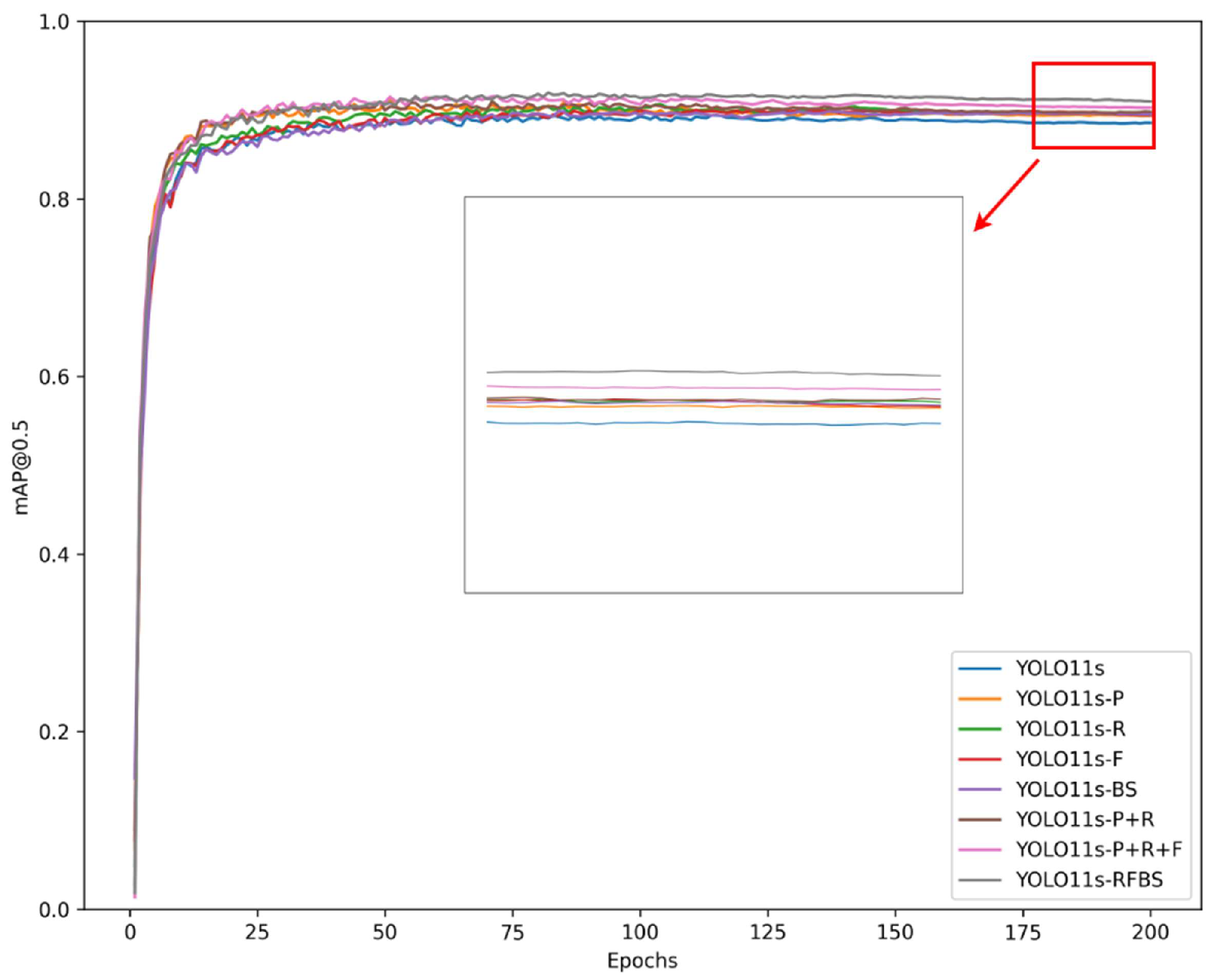 In this study, four improvements were introduced to the YOLO11s baseline model: (P) replacing the original P5 detection head with a P2 head while keeping the P3 and P4 heads unchanged; (R) substituting the conventional backbone convolution with RFAConv; (F) introducing the lightweight C3k2-Faster module instead of the original C3k2 structure; and (BS) integrating BIFPSNN into the neck.