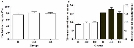 The fruit setting rates of the H, HB, and BB groups are shown in Figure 1A, being 75.36% ± 5.29, 81.07% ± 3.78, and 78.57% ± 3.93, respectively. There was no significant difference between the three groups (p = 0.6954). There were no significant differences between the three groups in the transverse diameter (p = 0.3400) and longitudinal diameter (p = 0.2007) at 1 DAP (Figure 1B).
