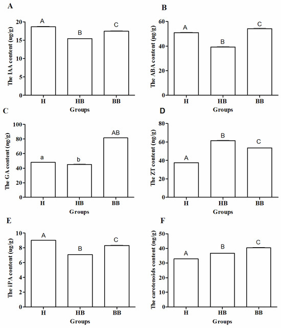 Content of six endogenous compounds in watermelons in the H, HB, and BB groups at 1 DAP. (A) IAA, indole-3-acetic acid. (B) ABA, abscisic acid. (C) GA, gibberellin. (D) iPA, isopentenyl adenosine. (E) ZT, zeatin. (F) Carotenoids. Different lowercase letters (p < 0.05) and capital letters (p < 0.01) represent statistically significant differences between two groups; no letters indicate no significant difference between the two groups (p > 0.05).
