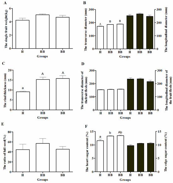 The single fruit weight, fruit and flesh size, rind thickness, sugar content, and full seed rate of mature watermelons. (A) Single fruit weight; (B) transverse and longitudinal diameter of whole watermelon; (C) rind thickness; (D) entire transverse and longitudinal diameter of flesh; (E) proportion of full watermelon seeds; (F) center and edge sugar. Different lowercase letters (p < 0.05) and capital letters (p < 0.01) represent statistically significant differences between two groups; no letters indicate no significant difference between the two groups (p > 0.05).