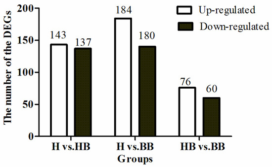 Nine cDNA libraries were constructed and analyzed (Supplementary File Table S1). The differentially expressed genes (DEGs) identified between the groups are shown in Figure 4 (Supplementary File Table S2). In total, 280 DEGs (143 upregulated DEGs and 137 downregulated DEGs), 324 DEGs (184 upregulated DEGs and 140 downregulated DEGs), and 136 DEGs (76 upregulated and 60 downregulated) were identified in H vs. HB, H vs. BB, and HB vs. BB, respectively. Gene annotation identified the differential expression between the three groups, including gene-encoding transcription factors (TFs), zinc finger proteins (ZFPs), cytochrome P450, heat shock proteins (HSPs), and so on (Supplementary File Table S3).