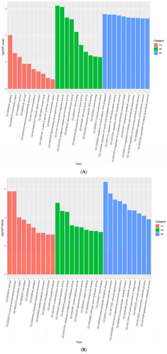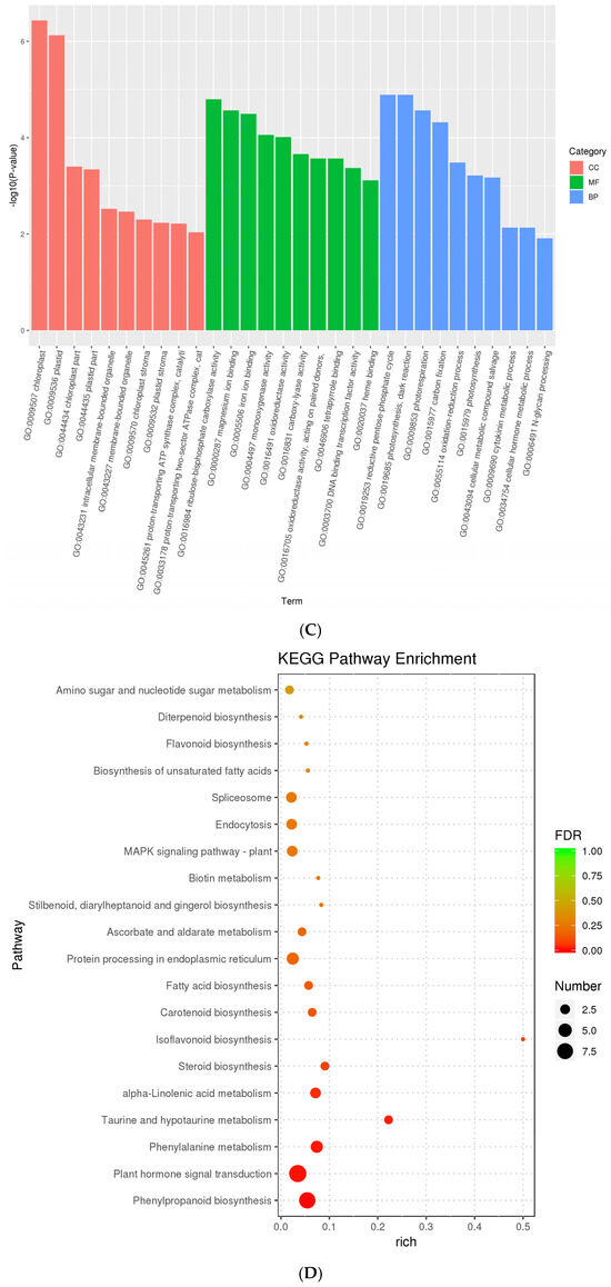 GO items with the smallest p-values (top 10) in each GO category are displayed (Figure 5A–C). The DEGs between the H and HB groups were involved in functions such as transcriptional regulation and macromolecular biosynthesis regulation (Figure 5A). The DEGs between groups H and BB were involved in plastid structure, oxidoreductase activity, and carbohydrate metabolism processes (Figure 5B). The DEGs between the HB and BB groups were mainly involved in chloroplast, plastid, and oxidoreductase processes, as well as ion binding, enzymatic activity, and photosynthesis (Figure 5C).