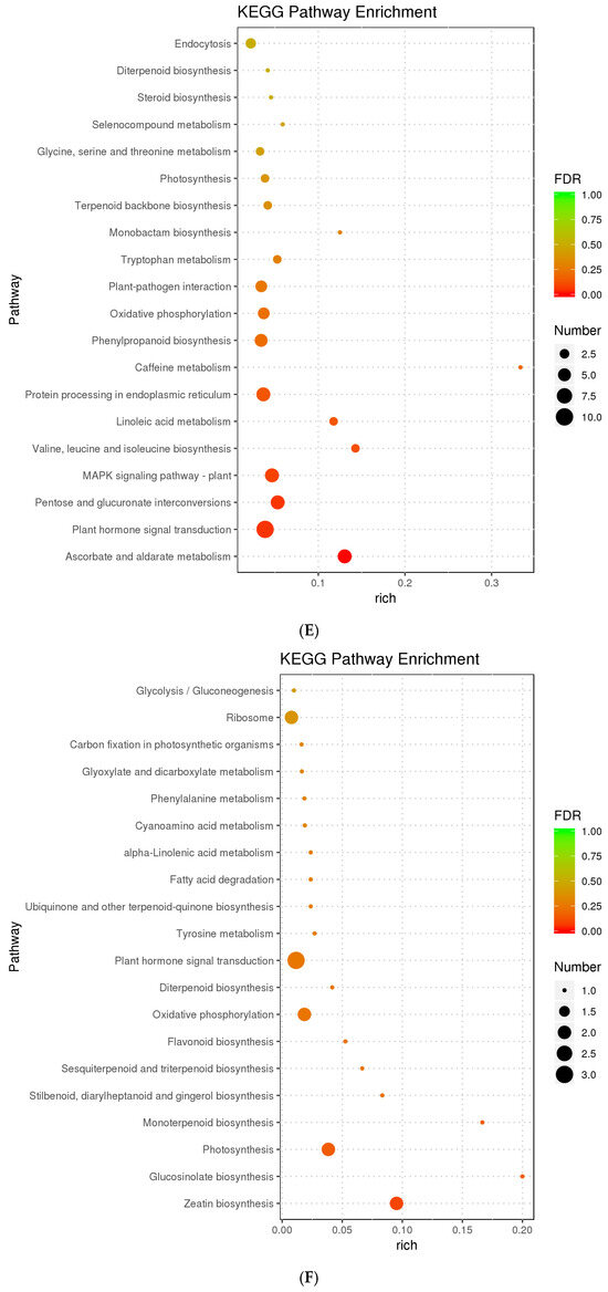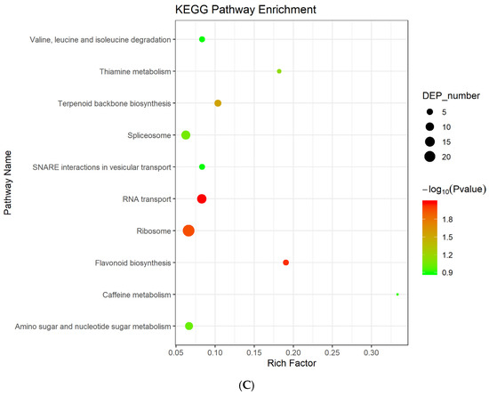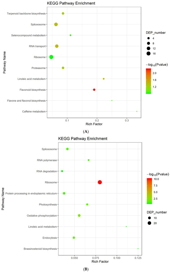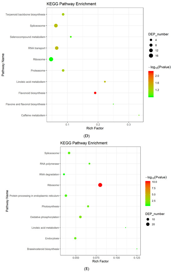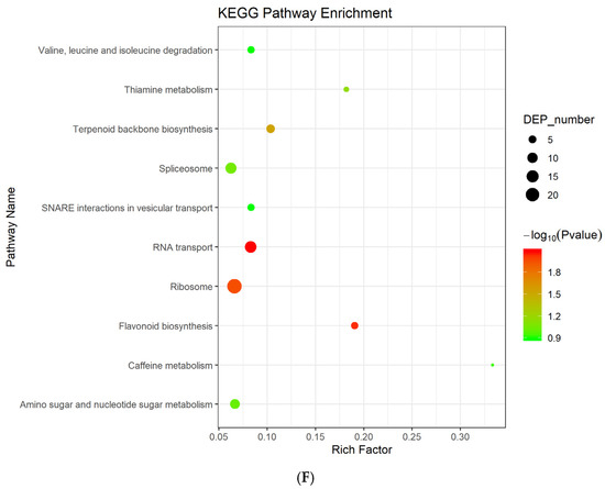 KEGG analysis revealed that the DEPs between the H and HB groups were significantly enriched in flavonoid biosynthesis, RNA transport, and linoleic acid metabolism (Figure 7D). The DEPs between the H and BB groups were mainly involved in ribosomes, oxidative phosphorylation, and photosynthesis (Figure 7E). Flavonoid biosynthesis, RNA transport, and ribosomes were the main pathways involved in DEPs between the HB and BB groups (Figure 7F).