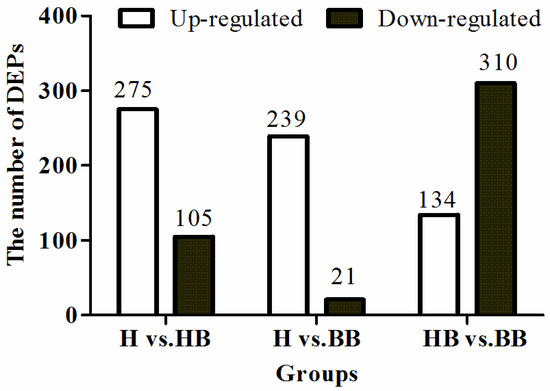 A total of 10,110 proteins were identified using ITRAQ-labeled quantitative proteomics (Supplementary File Table S5). The results of the DEPs between the different groups are shown in Figure 6. In total, 380 differentially expressed proteins (DEPs) (275 upregulated and 105 downregulated), 260 DEPs (239 upregulated and 21 downregulated), and 444 DEPs (134 upregulated and 310 downregulated) were screened in H vs. HB, H vs. BB, and HB vs. BB, respectively.