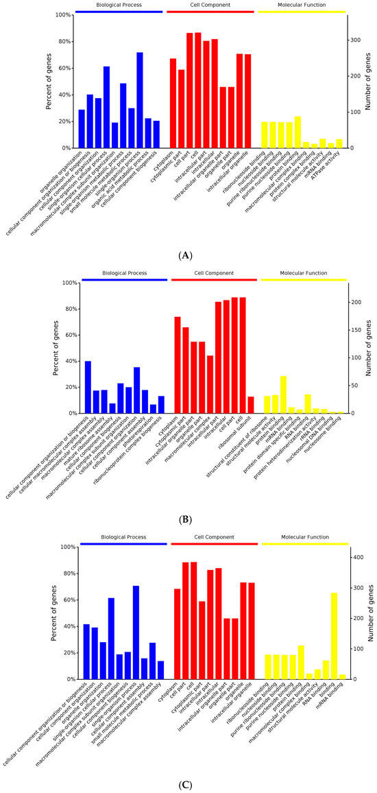 The GO terms associated with the identified DEPs between groups were analyzed (Figure 7A–C). In H vs. BB, most DEPs were enriched in biological process (BP), followed by cell component (CC) and molecular function (MF). Among all the groups, in terms of the number and percentage of DEPs, more proteins were distributed in CC. The DEPs between the H and HB groups were mainly concentrated in cell, intracellular part, cellular component organization or biogenesis, and protein and RNA binding (Figure 7A). The DEPs between the H and BB groups were mostly involved in macromolecular complex assembly and binding (Figure 7B). The DEPs screened between the HB and BB groups were involved in cell, intracellular part, and cellular component organization or biogenesis, as well as macromolecular complex binding (Figure 7C).