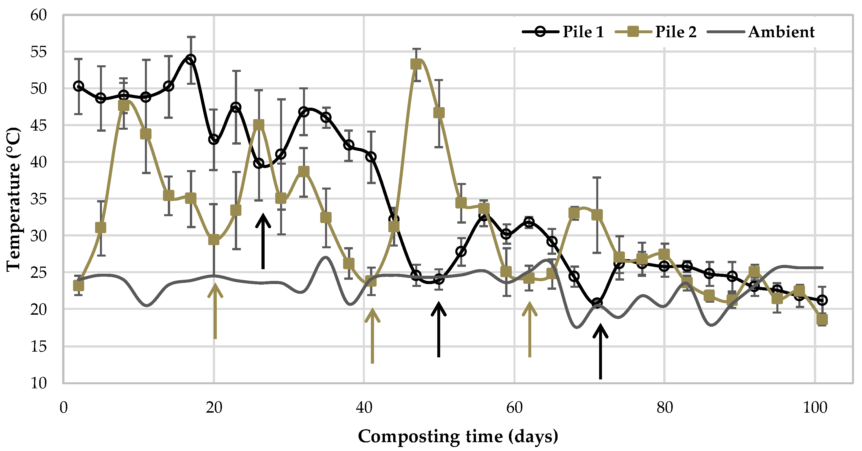 - Valverde-Orozco, V.; Gavilanes-Terán, I.; Idrovo-Novillo, J.; Carrera-Beltrán, L.; Basantes-Cascante, C.; Bustamante, M.A.; Paredes, C. Agronomic, Economic and Environmental Comparative of Different Aeration Systems for On-Farm Composting. Agronomy 2023, 13, 929. [Google Scholar] [CrossRef]