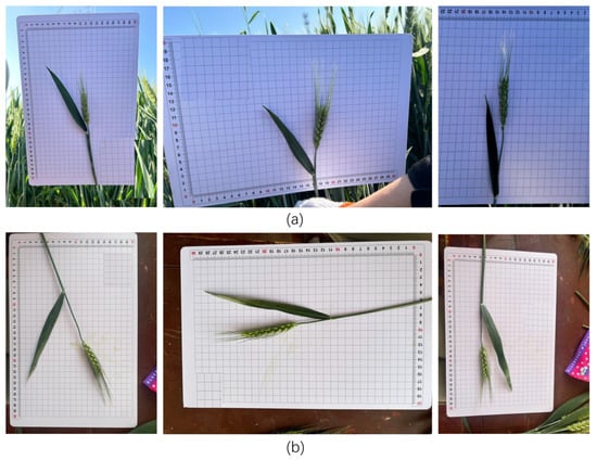 Individual wheat ears were studied and data was collected in the above-mentioned area. From 10 April to 20 May 2024, between 7:00 and 19:00 daily, image acquisition covered four key fertility stages: nodulation, tasseling, flowering, and grouting. To enrich data dimensions, different fertilization treatment and fertility stage combinations were set. A 1 cm2 grid background plate was used for dual-mode shooting: outdoor natural light (including sunny, cloudy, rainy weather) and indoor controlled-environment shooting. High-resolution images were taken with an iPhone 14 (12-megapixel dual rear camera) and a Nikon Z30 (20.9 megapixels). After cleaning and screening, a dataset of 885 wheat ear images was created. Some samples are shown in Figure 2, and variety distributions and quantities are detailed in Table 1, offering multi-dimensional data for wheat ear phenotype research.