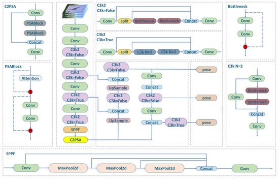 YOLOv11-pose uses a top-down two-phase keypoint detection architecture, the “detection-keypoint localization” model, as shown in Figure 4. It has a lightweight backbone and a multi-branch header network, with five configurations (n, s, m, l, x). Its complexity can be adjusted via [depth, width, max_channels] parameters for different computing environments. The backbone integrates the C3F module and improved E-Conv structure, enhancing feature extraction by maintaining multi-scale aggregation during 3 × 3 convolutional down-sampling. The head network applies a hierarchical decoding strategy, optimizing multi-scale weights with the DFF mechanism. Integrated with the C3F module through up-sampling splicing, the Pose Head module outputs keypoint heatmaps and offsets for accurate localization.